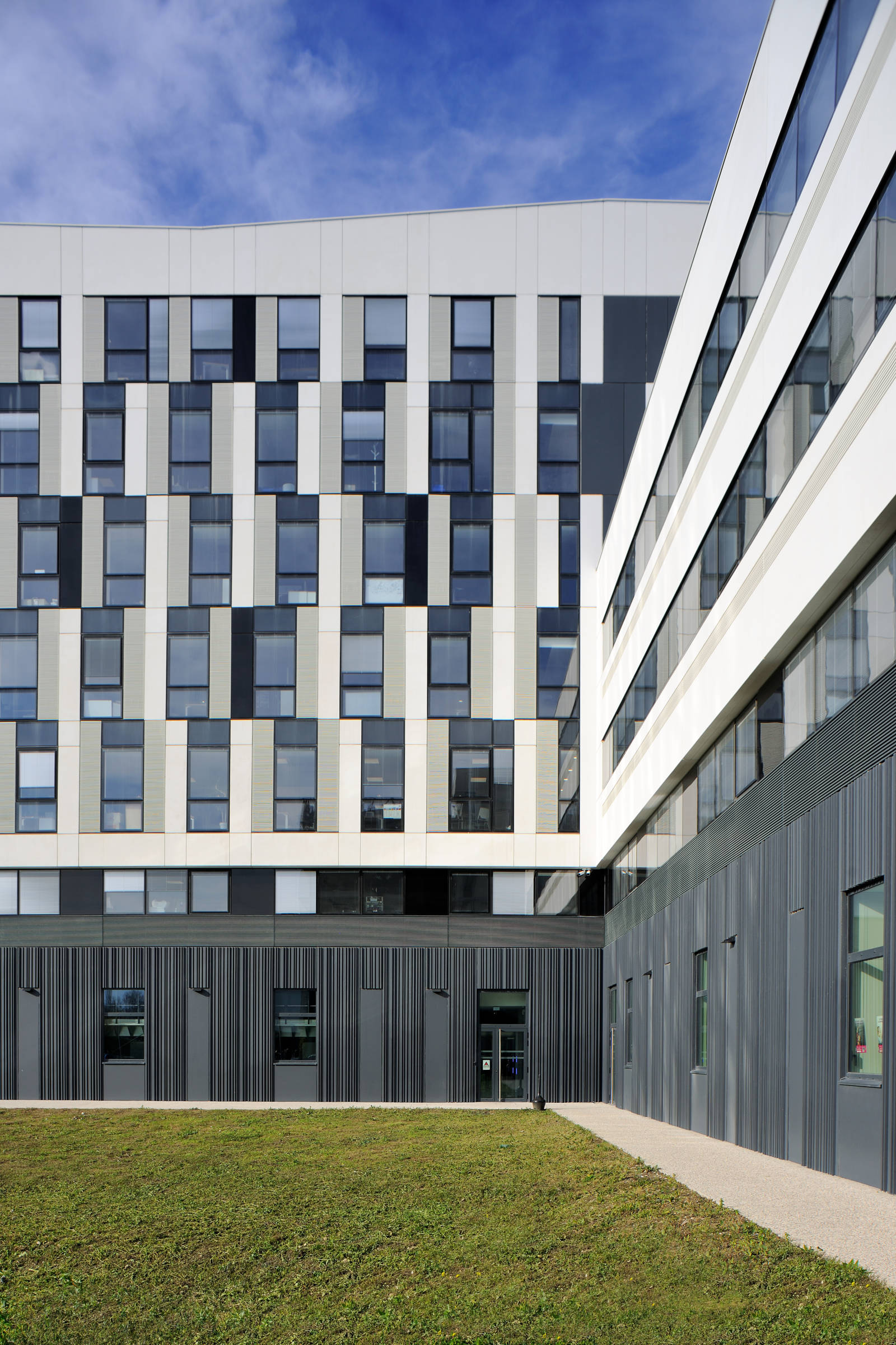 d’Oxford. Le site, longeant la N481, offre à EDF une vitrine imprenable en entrée de ville. Le Pôle Hydraulique se développe sur un socle de 2 étages en béton rythmé verticalement. Trois volumes verticaux perpendiculaires en R+6 offrent en signal leurs pignons marqués de 3 lames en béton blanc qui encadrent les espaces nobles, vitrés, ouverts sur la vallée. Ces 3 volumes verticaux sont reliés par des bâtiments plus bas, en R+3. Labellisé BREEAM, ce pôle vise la haute qualité environnementale : efficacité énergétique et GTC sophistiquée, dalles actives par géothermie, terrasses végétalisées et jardins intérieurs faisant office de rétention en cas de pluies exceptionnelles.
