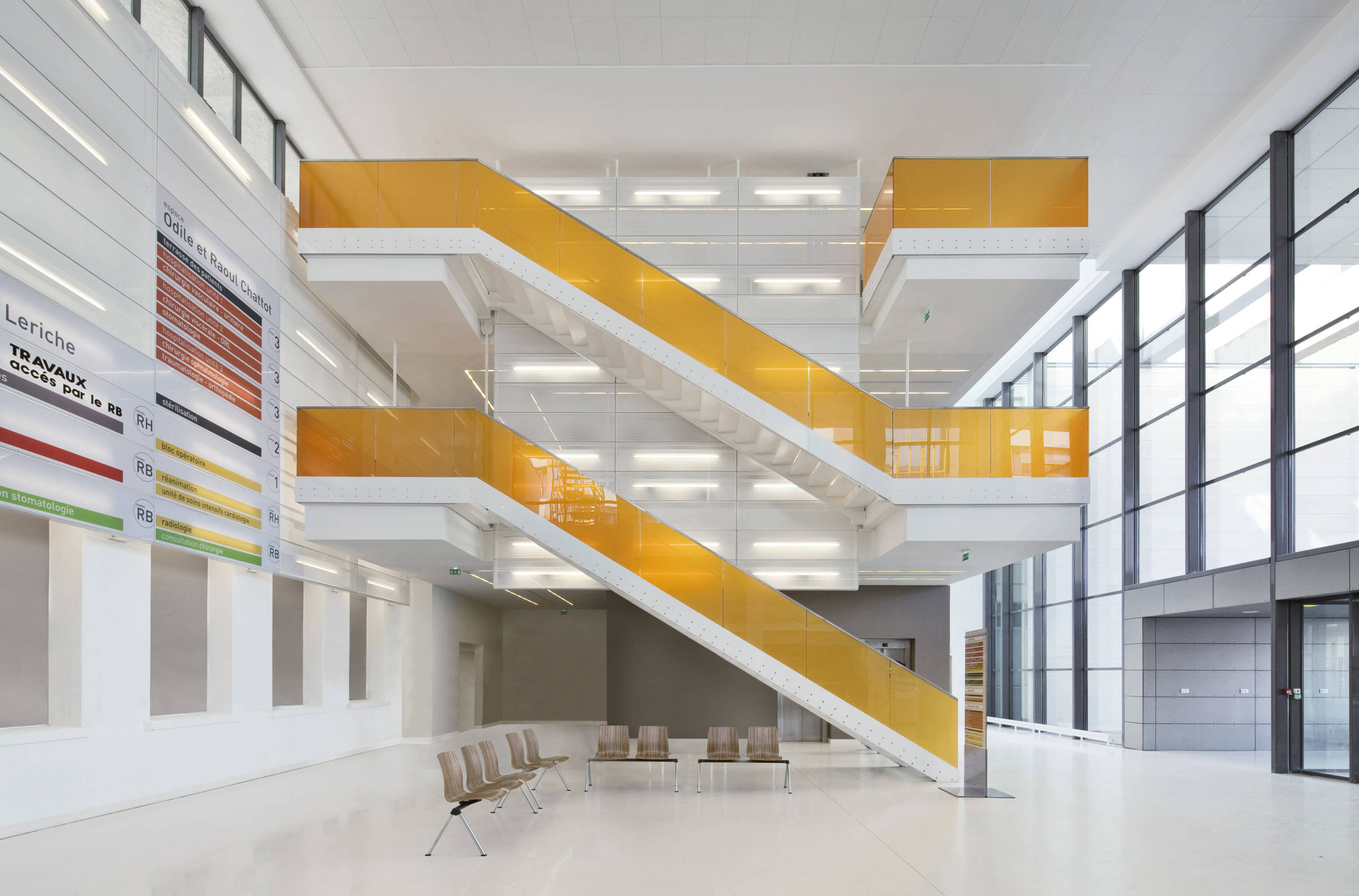 Afin de redonner clarté, lisibilité et unité à l’ensemble du site hospitalier, la réhabilitation et l’extension du Centre Hospitalier de Roanne définit une architecture simple et à l’identité forte, pour un dialogue renoué avec la ville. Le site est réécrit sur deux lignes directrices Est-Ouest et Nord-Sud rattachant clairement le nouveau centre de santé à sa ville et à la Loire, son fleuve. Avec une écriture horizontale, soulignée par les lignes des dalles et des porte-à-faux en façade Nord-Ouest, il offre un visage humain. Un habillage haut en couleur de ce jeu linéaire permet d’identifier depuis l’extérieur les divers niveaux de fonctions et de rendre confortable les espaces médicalisés proches des zones d’accès.