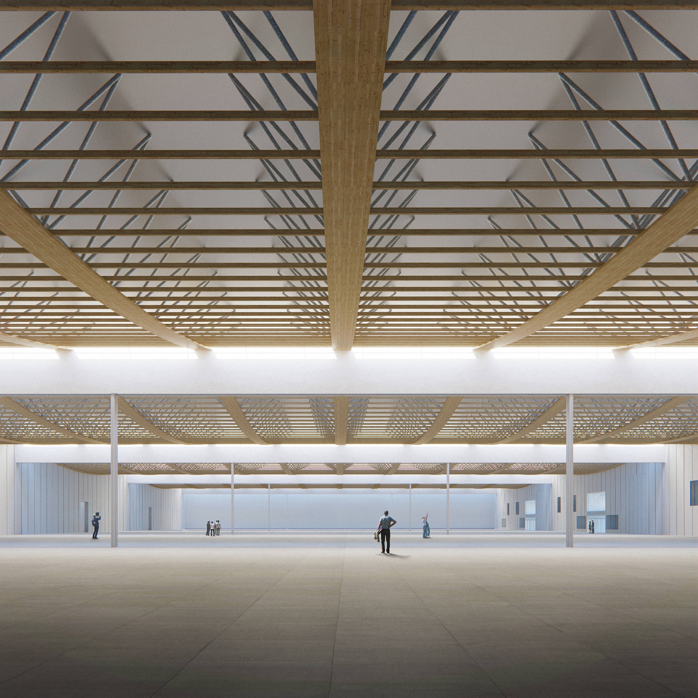 Le projet s’articule autour d’une grande halle, divisible mais pensée dans son aménagement pour une exposition unique. Les séparatifs s’intercalent à travers un grand plan d’ensemble qui fonctionne sans aucun changement de réseaux ou autre modification d’implantation. Le rythme architectural de la halle, souligné par les grandes poutres qui la structurent et l’éclairent, amorce une modénature nord sud qui rythme l’ensemble de l’espace public. Le parvis s’insère dans cette modénature avec une trame adaptée qui permet de prolonger les surfaces d’expositions à l’extérieur pour une disposition «sous douane» tout en offrant une liberté, une disponibilité et une appropriation possible de l’espace public en toute circonstance. Les transparences et continuités intérieur/ extérieur, permises à travers le hall d’entrée et les larges ouvertures de l’espace évènementiel, contribuent à la lisibilité d’ensemble de l’espace ainsi produit.