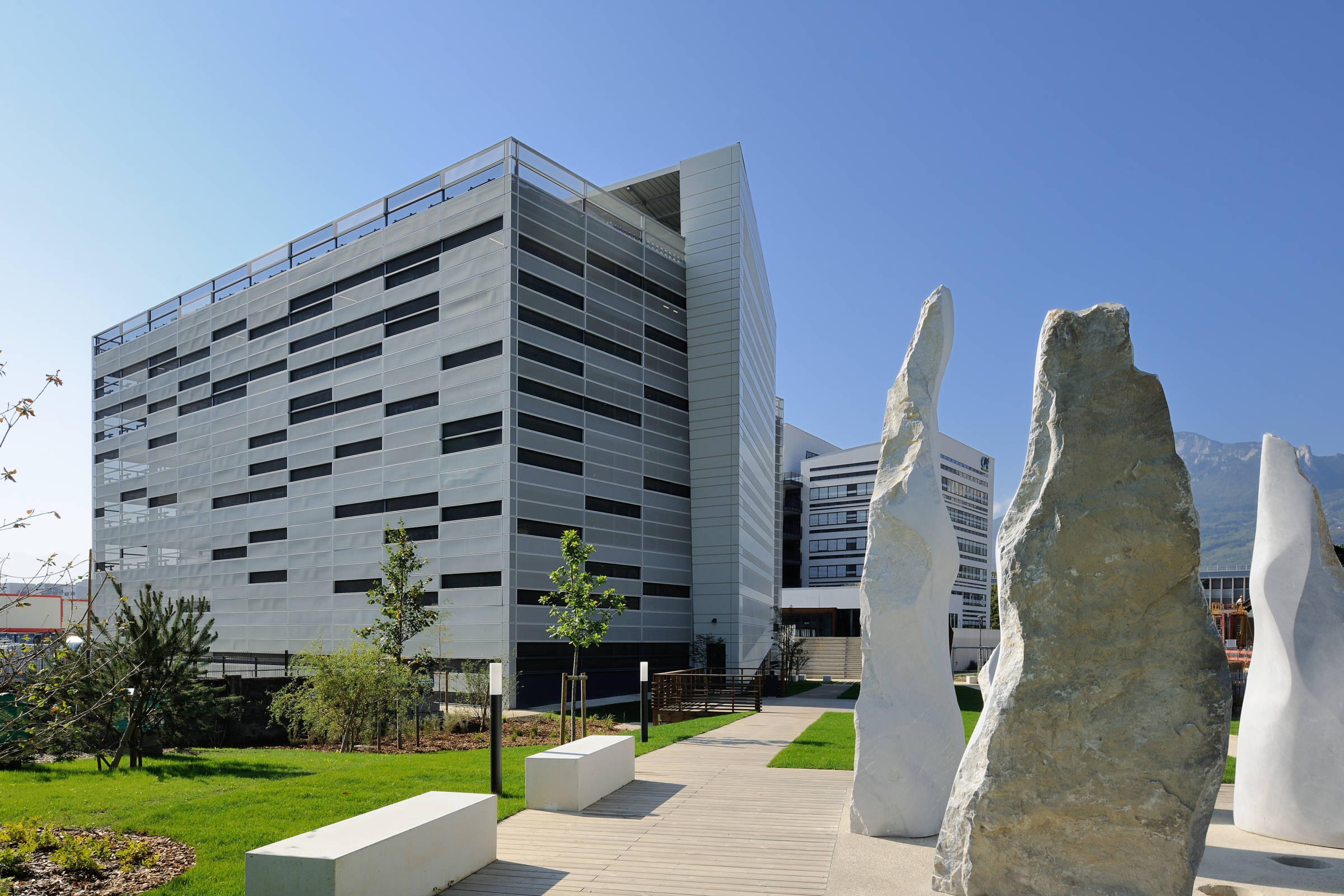 C’est un signal d’entrée sur la Presqu’île par le pont d’Oxford, visible depuis la voie cycliste sur berge, et forme un point focal au bout de l’avenue des Martyrs. Les trois bâtiments du projet présentent des volumes fragmentés, y compris le parc de stationnement constitués de deux ensembles décalés en hauteur, comme le sont les demi-niveaux à l’intérieur, couturés par un élément central plus haut. L’implantation du bâti sur la parcelle, conjuguée aux jeux des volumes, aux perspectives offertes, et aux espaces paysagers, confère au siège du Crédit Agricole Sud Rhône Alpes un caractère de campus contemporain.