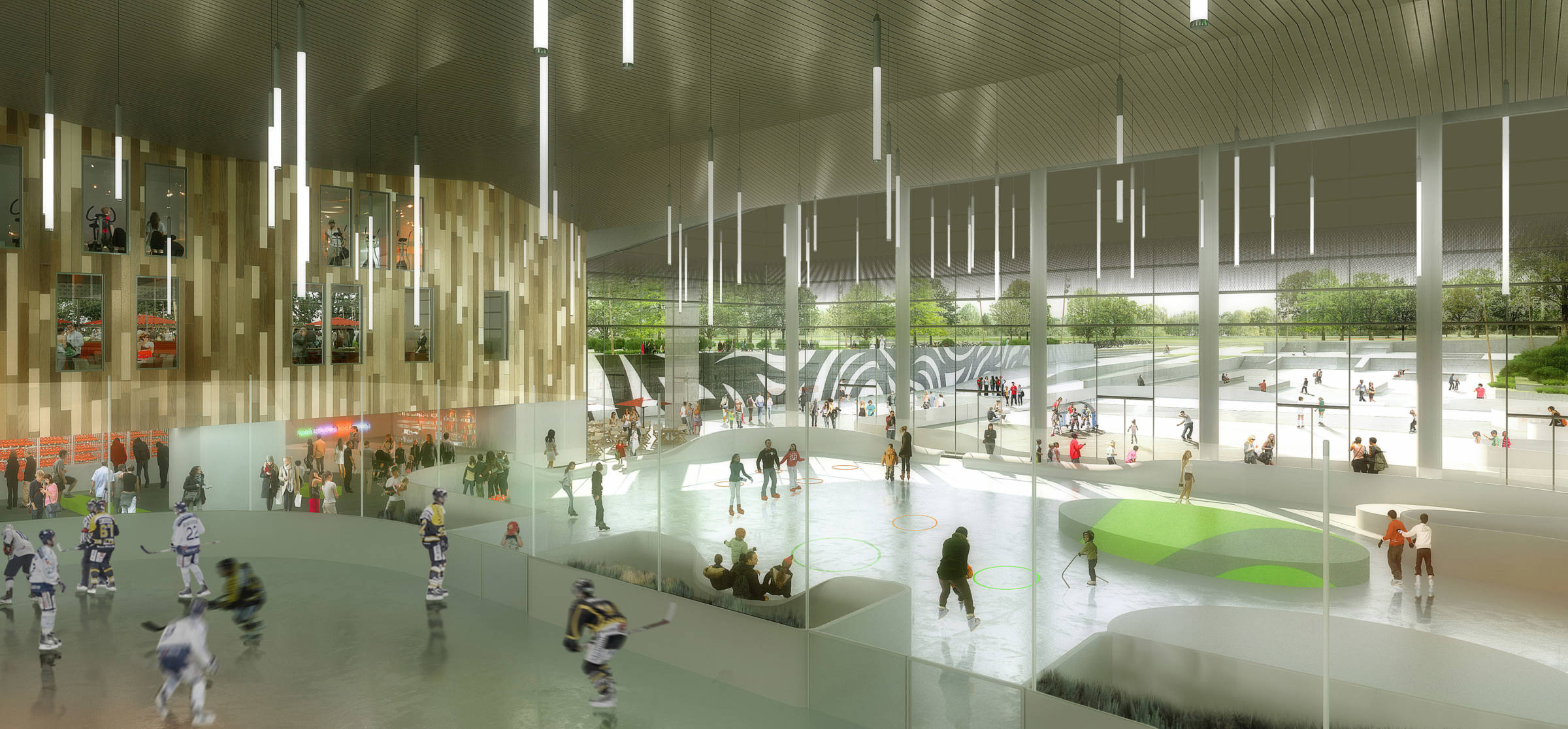 The GESPEL project is the response to a pioneering brief for the promotion of ice sports in France. This very high-level multifunctional sports facility, which is both playful and cultural and attracts visitors from the entire northwest section of the Ile-de-France region, was an opportunity to develop a tripke ice rink to host international matches, training sessions, and a leisure rink for the general public. The building, a real landmark on the edge of the A15 motorway forms part of a wide-ranging landscaping initiative covering the entire plain and involving architecture, planning and landscape design. The edgy, incisive design suggests a sense of fluid movement as we walk towards the concourse. The entrance makes the most of the natural slope; with its remarkable awning, it is situated halfway up the slope on the south side, creating a kind of belvedere. An outdoor rink forms an extension of the main rink and opens it up to the surrounding city.
