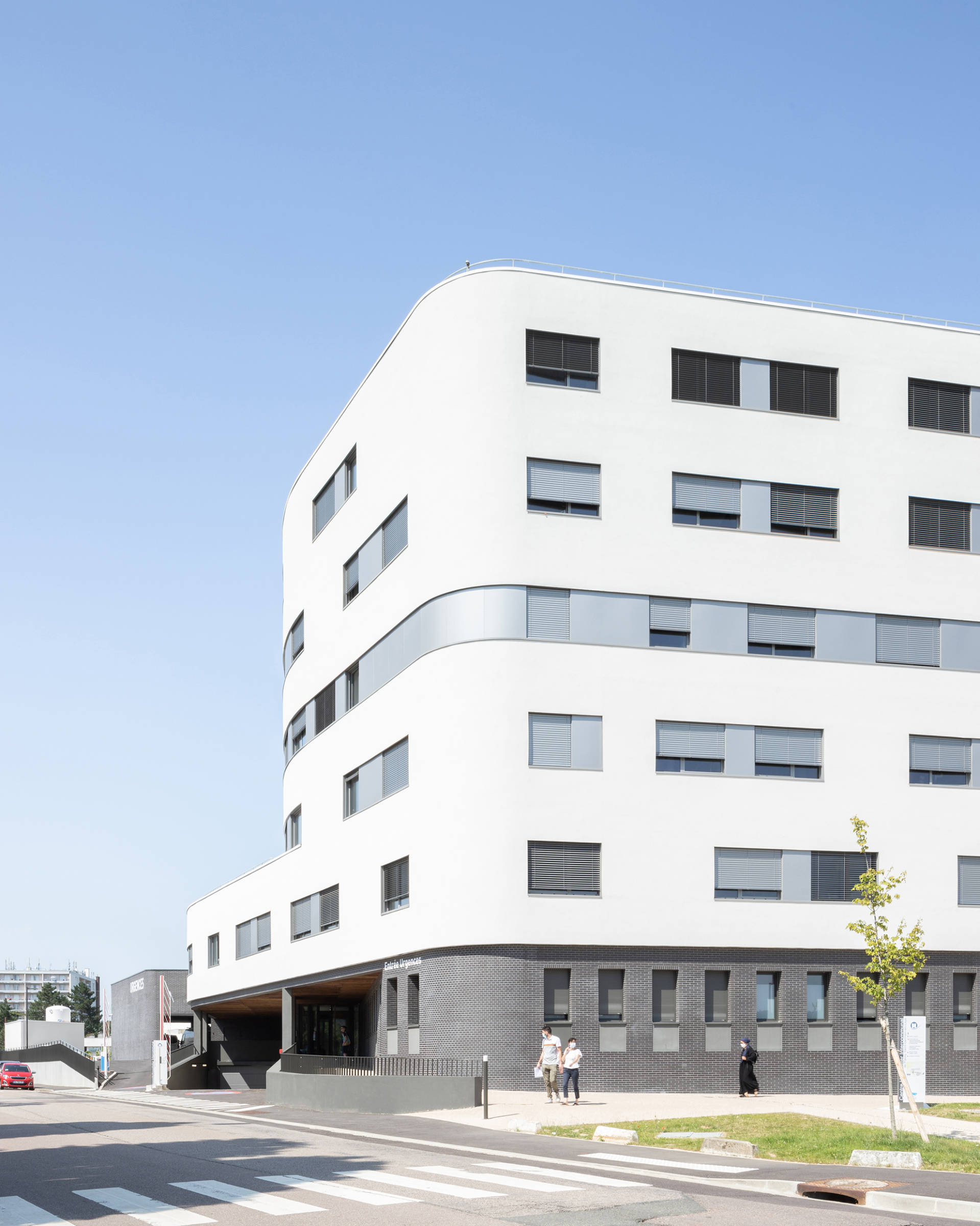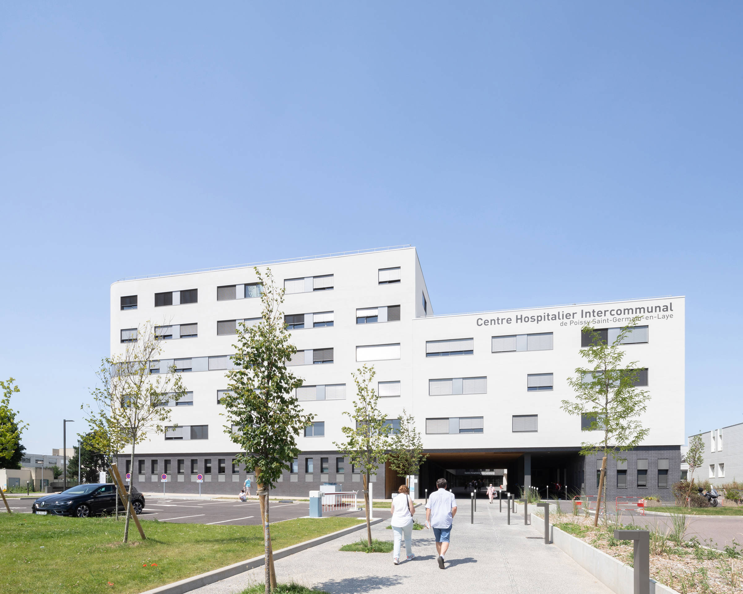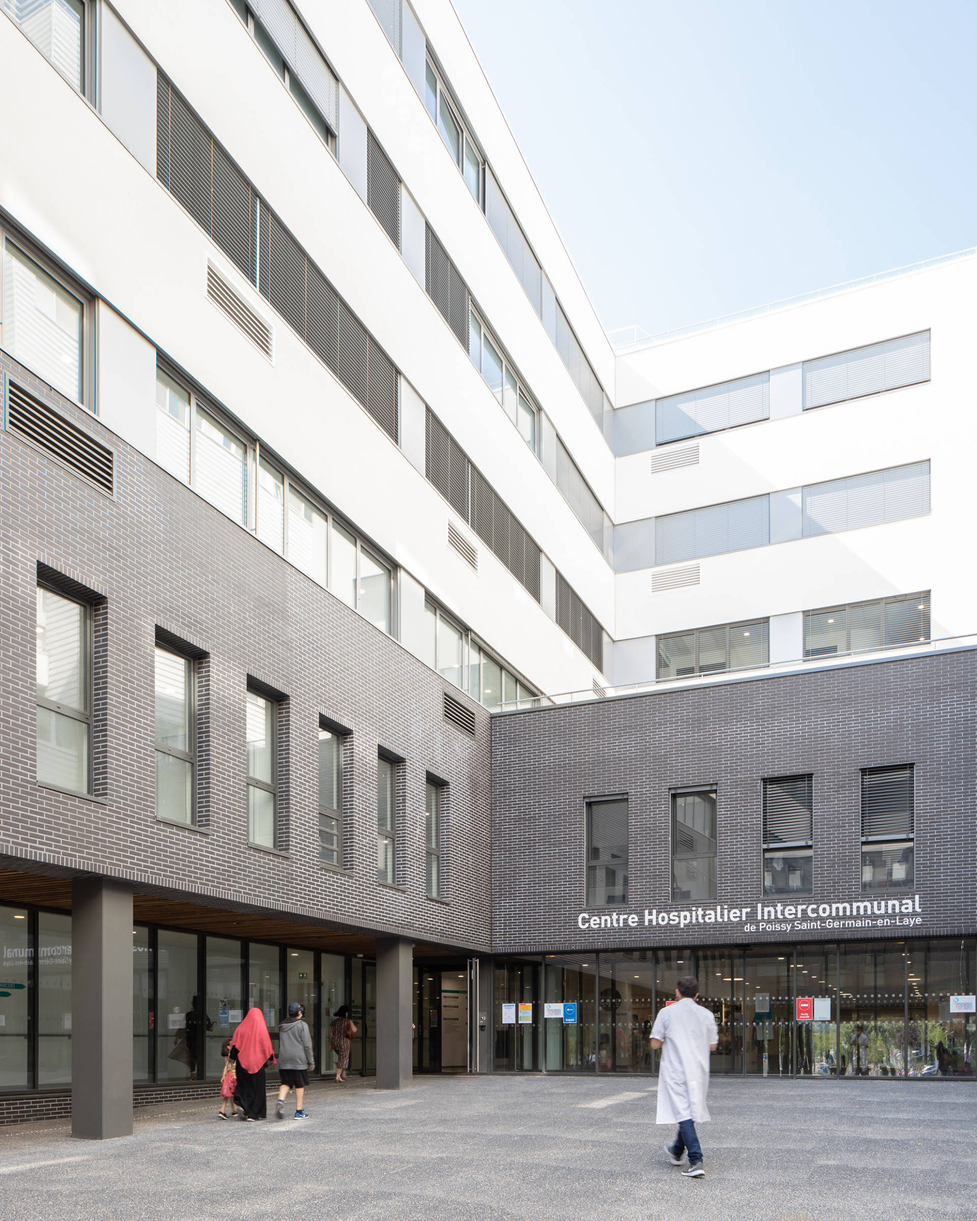 The purpose of the extension to the CHIPS hospital is to group together most of the medical services and full hospitalisation facilities (including maternity), as well as all the intensive care and A&E facilities, on the Poissy campus. The new building reconfigures the site overall, and also includes the main reception area for the hospital. It makes it possible to transform the entire site into a new campus that is coherent, attractive and optimised. Carried out while the site is occupied, the challenge is to work cleanly, safely and quickly, facilitating the future remodelling of the historic building and the completion of the master plan. The building has two angled façades that are both accessible and visible, housing two distinct entrances: the main entrance to the south and the entrance for emergencies to the west. Making the most of the slope, the main entrance is highlighted by a planted forecourt. Continuing on from the forecourt, the porch under the bridge section is highlighted by the façades of its dark-coloured base. Truly a transition between public and private space, it forms a protective threshold that provides shelter from the rain and sun and acts as a waiting area. This is followed by a Cortile—an inner courtyard—with a circulation area running alongside it, linking the main hall to the new building. With its exterior false ceilings and wooden screens, its dark brick cladding, its large cantilevered banner highlighting the entrance, its signage, its planted areas, its proportions and its special flooring, it is a welcoming building that defines the hospital’s new image.
