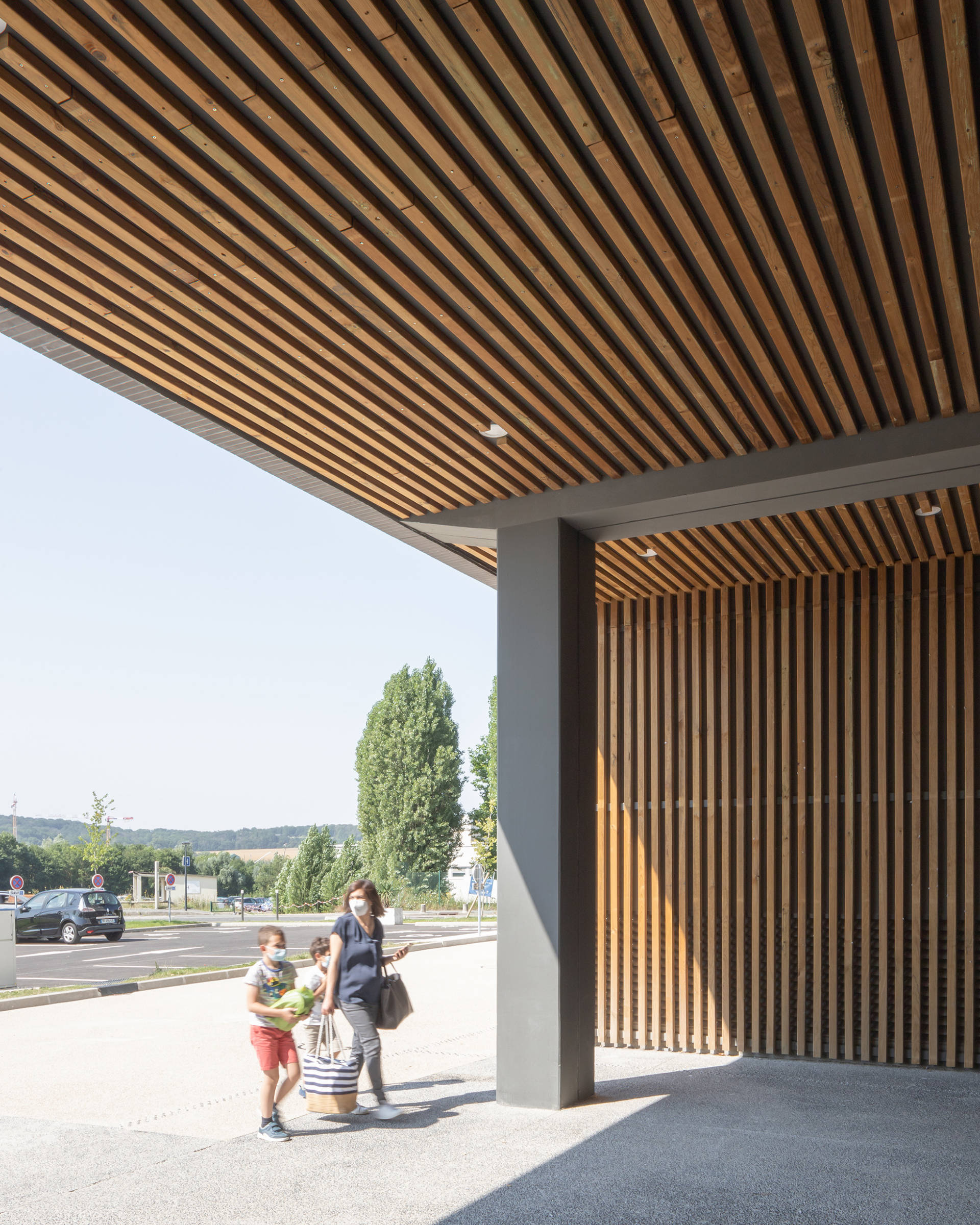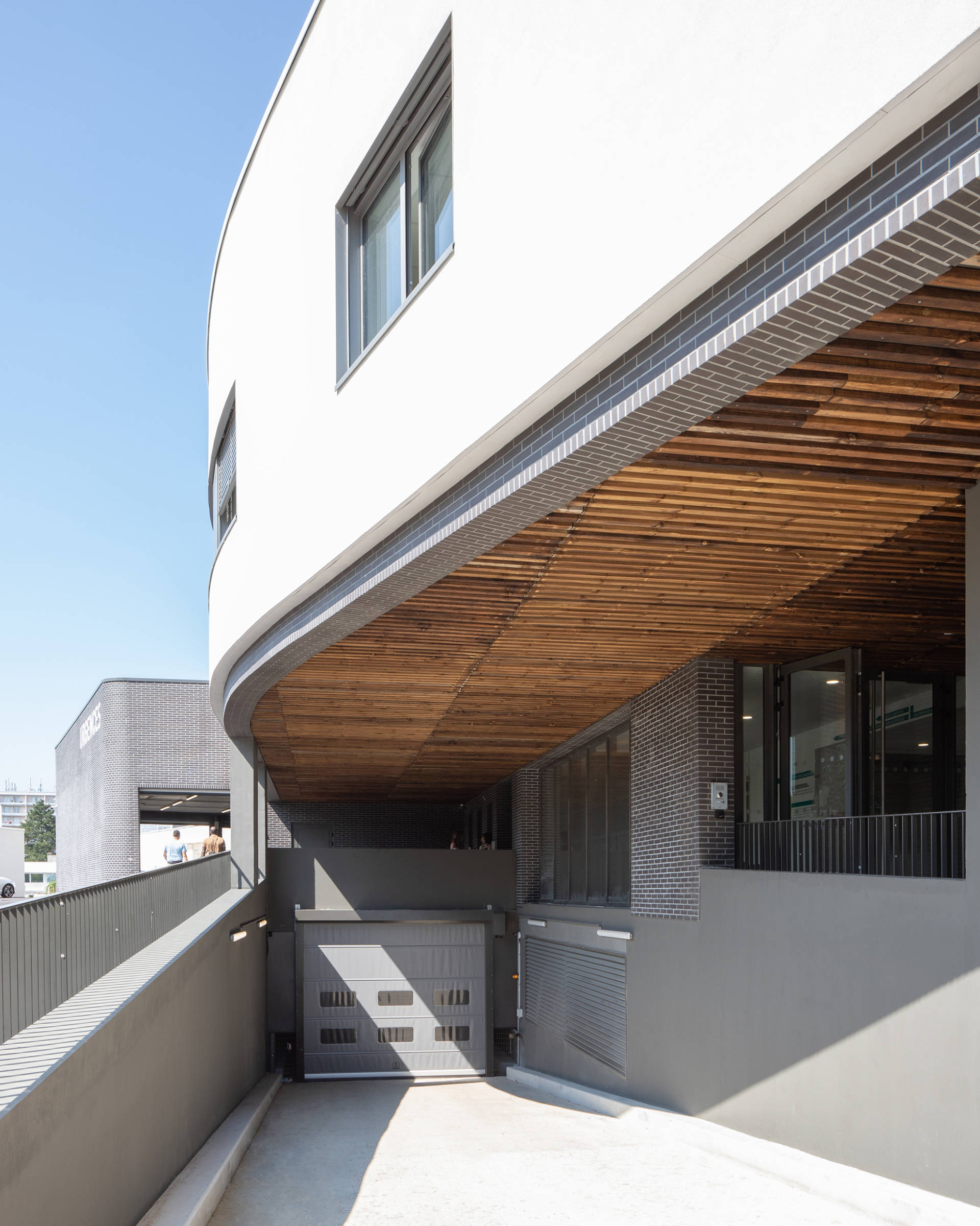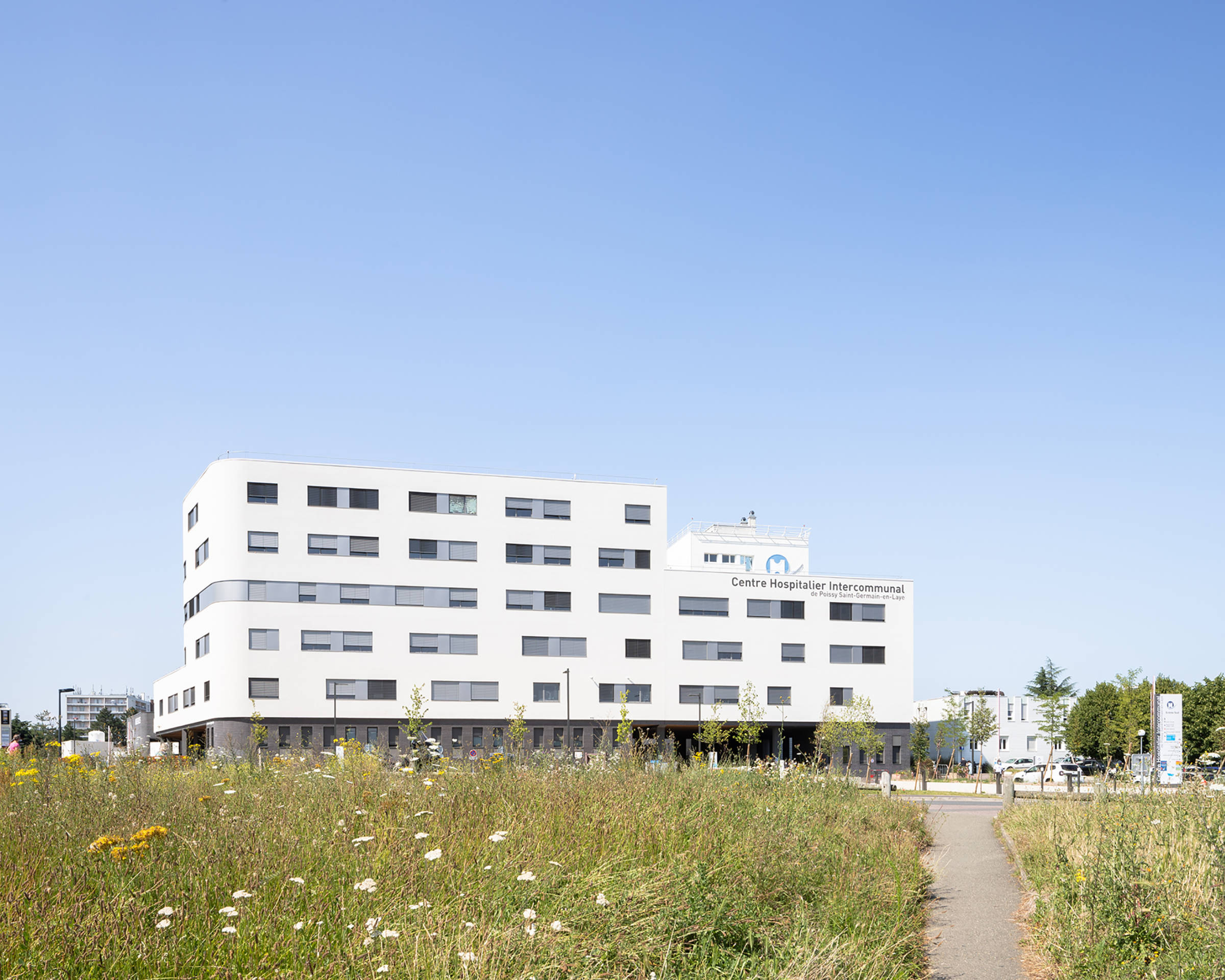 The purpose of the extension to the CHIPS hospital is to group together most of the medical services and full hospitalisation facilities (including maternity), as well as all the intensive care and A&E facilities, on the Poissy campus. The new building reconfigures the site overall, and also includes the main reception area for the hospital. It makes it possible to transform the entire site into a new campus that is coherent, attractive and optimised. Carried out while the site is occupied, the challenge is to work cleanly, safely and quickly, facilitating the future remodelling of the historic building and the completion of the master plan. The building has two angled façades that are both accessible and visible, housing two distinct entrances: the main entrance to the south and the entrance for emergencies to the west. Making the most of the slope, the main entrance is highlighted by a planted forecourt. Continuing on from the forecourt, the porch under the bridge section is highlighted by the façades of its dark-coloured base. Truly a transition between public and private space, it forms a protective threshold that provides shelter from the rain and sun and acts as a waiting area. This is followed by a Cortile—an inner courtyard—with a circulation area running alongside it, linking the main hall to the new building. With its exterior false ceilings and wooden screens, its dark brick cladding, its large cantilevered banner highlighting the entrance, its signage, its planted areas, its proportions and its special flooring, it is a welcoming building that defines the hospital’s new image.