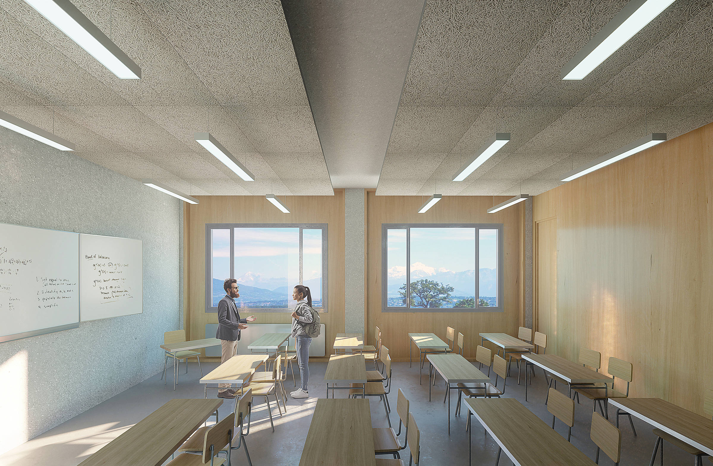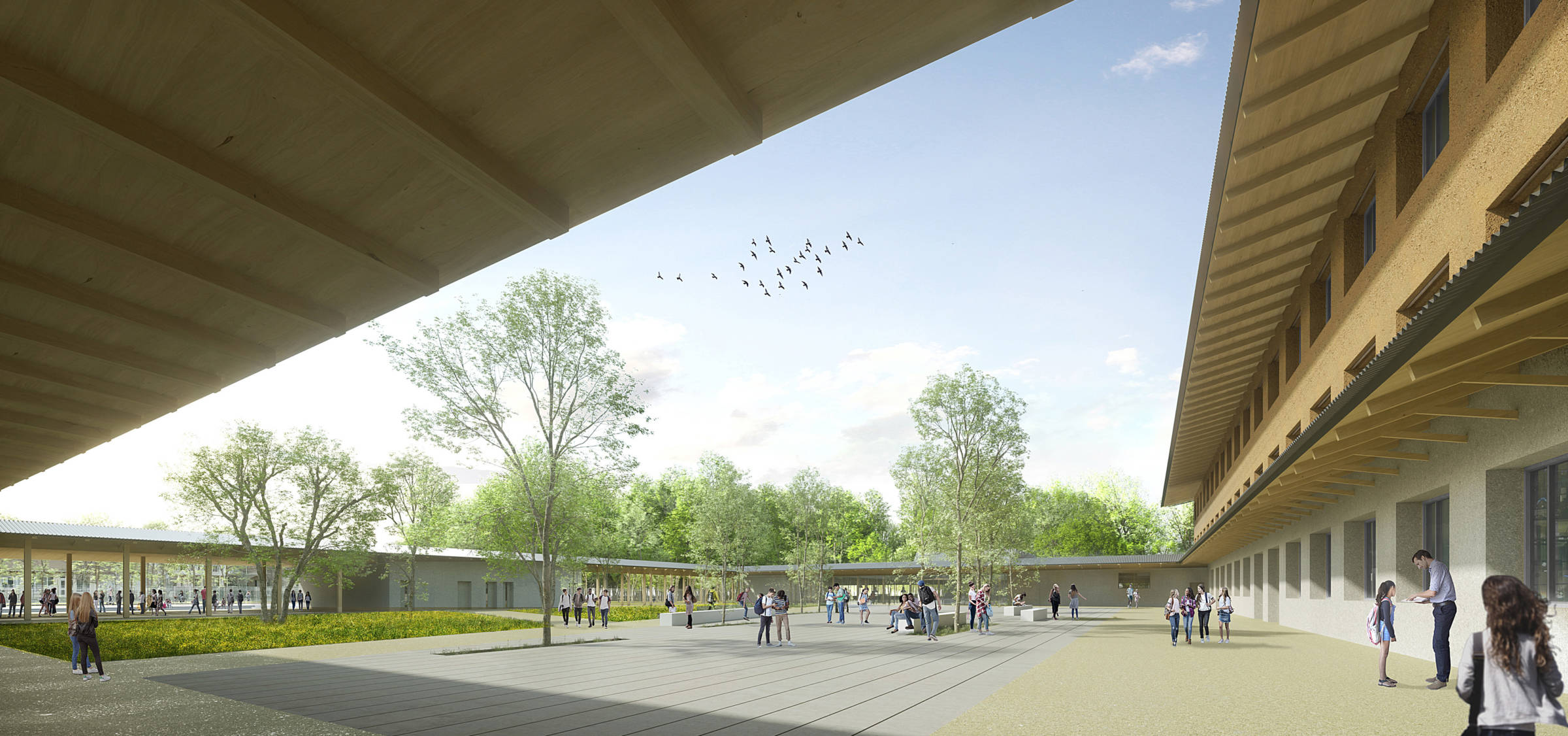 The landscape is also at stake. The views over the massifs are preserved. The secondary school’s low roofs are close to the school and guarantee the transparency through the courtyards. The architecture features plain volumes, matching with the region’s traditional rural buildings. The compact gymnasium stands a bit lower into the ground, in order to suit the scale of the neighbourhood’s building. Most of the structure is made of wood. The use of local resources allows the architecture to fit into its environment, thanks to the used materials, such as rammed earth and wood, whose natural colours match with the forest’s background. The strong identity of the educational centre is ensured by the overall unity feeling, while the brand-new sustainable buildings display the educational aim that lays underneath their design.