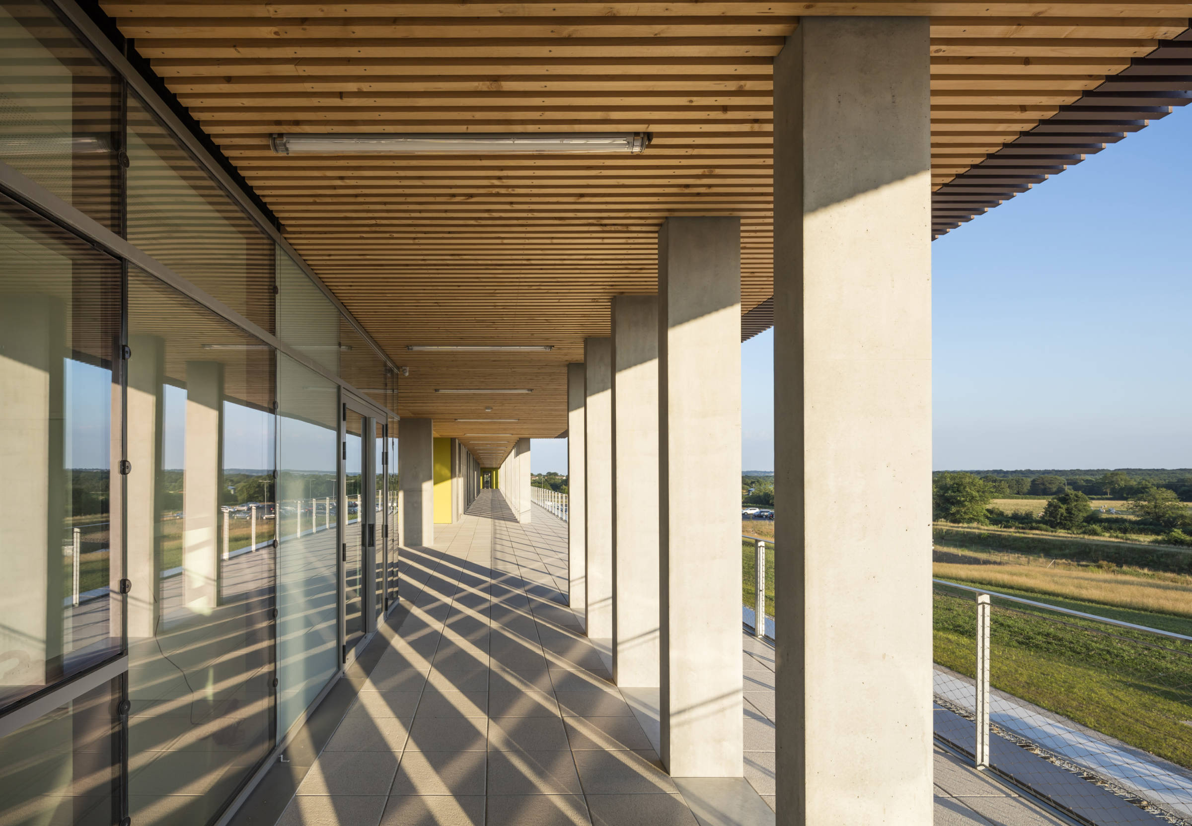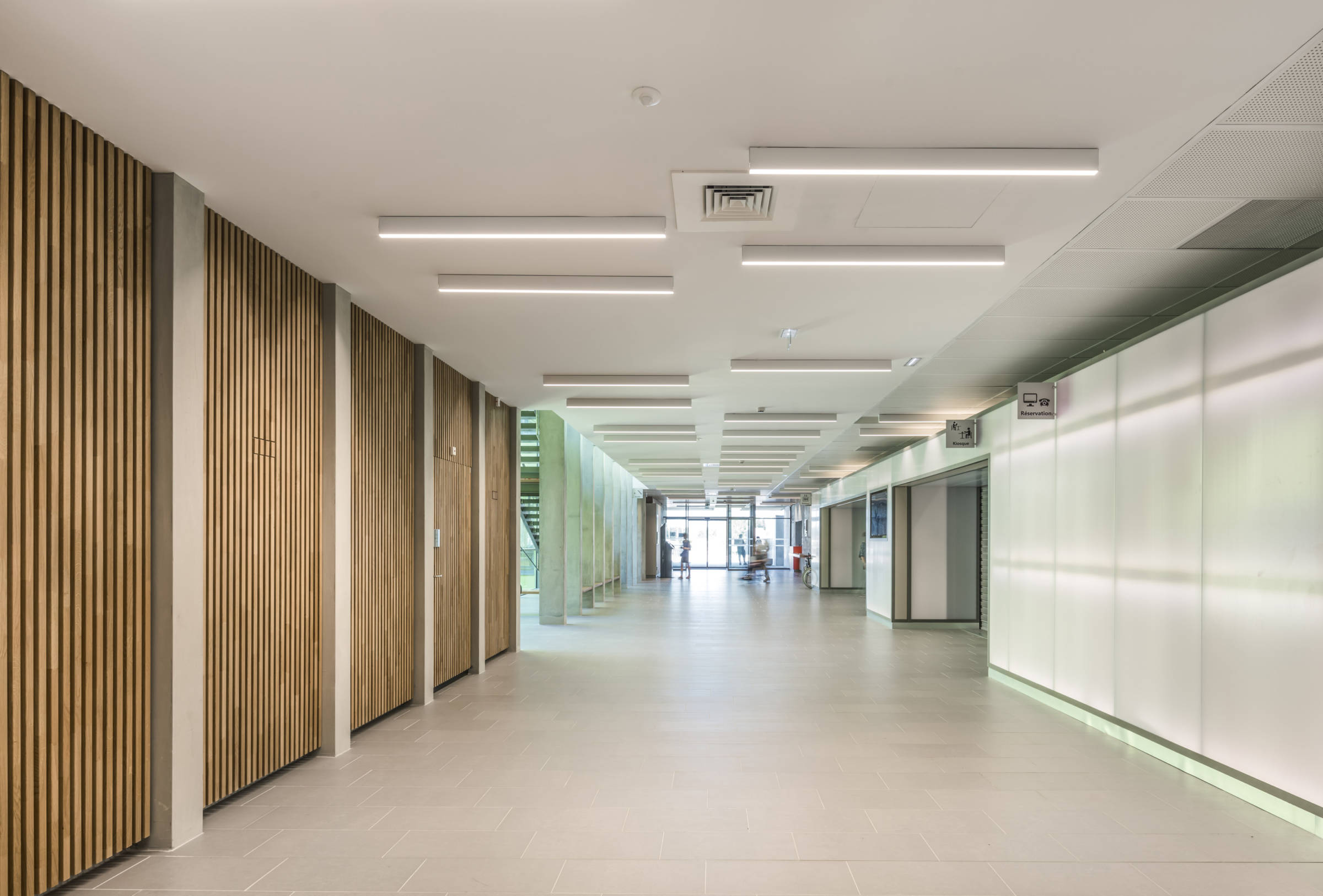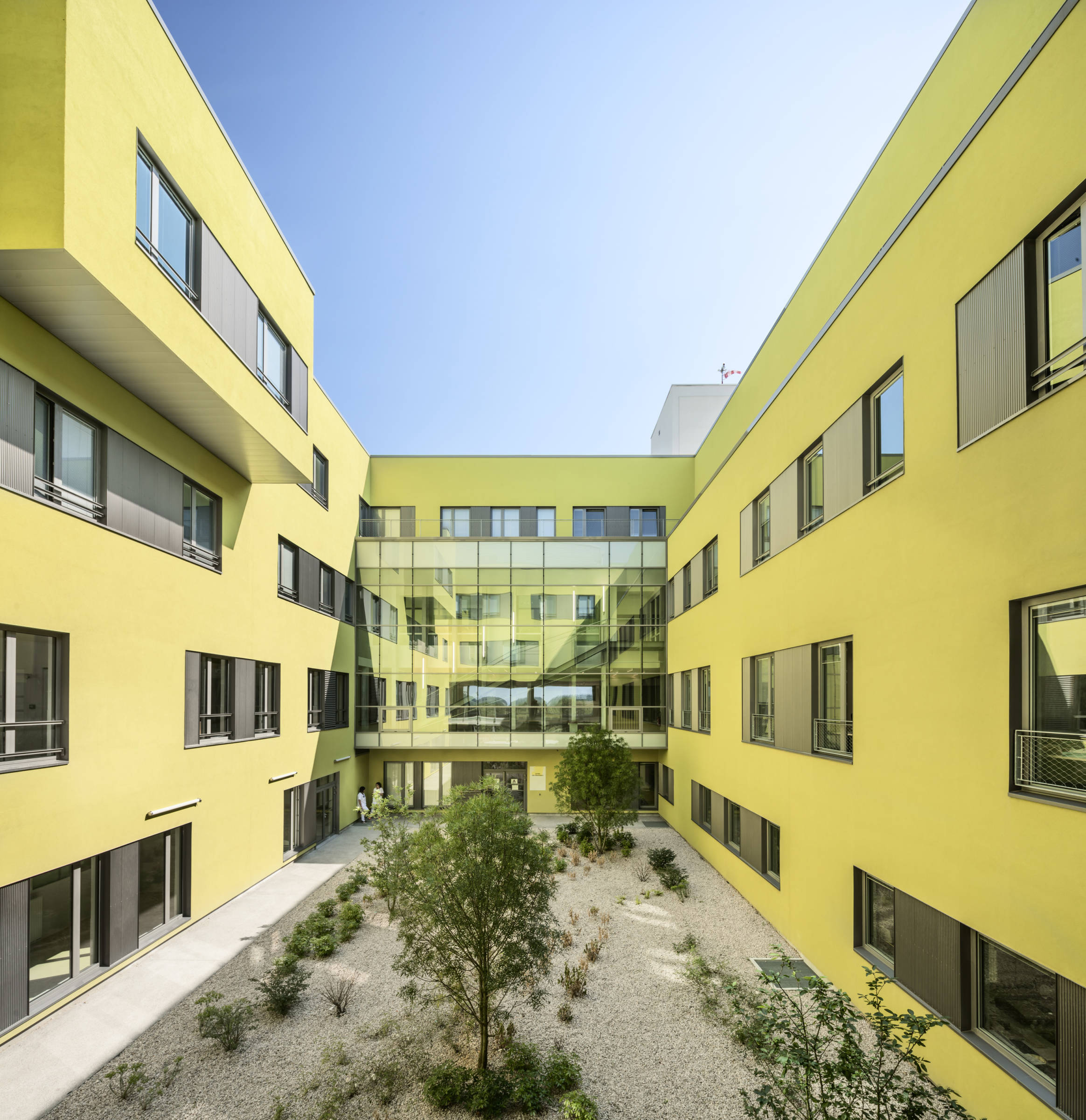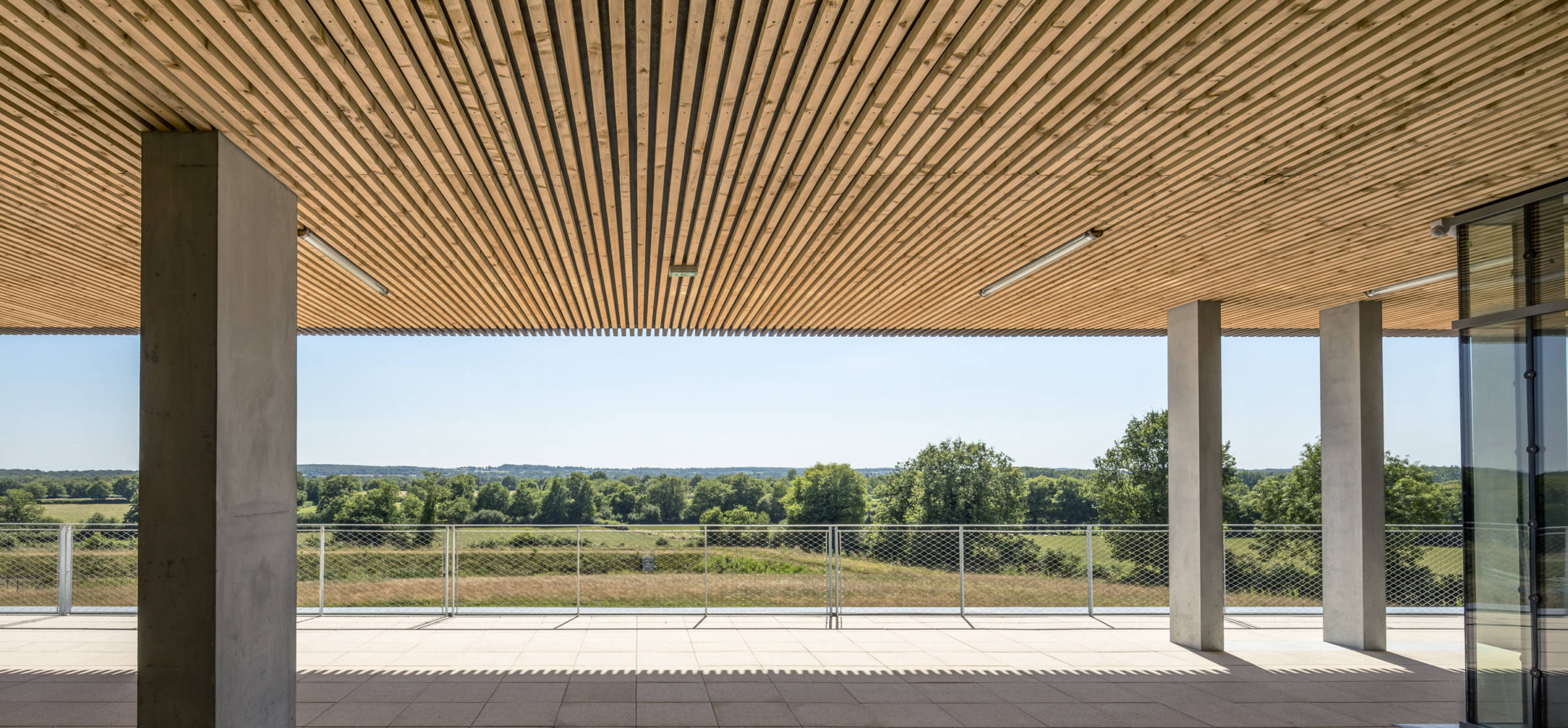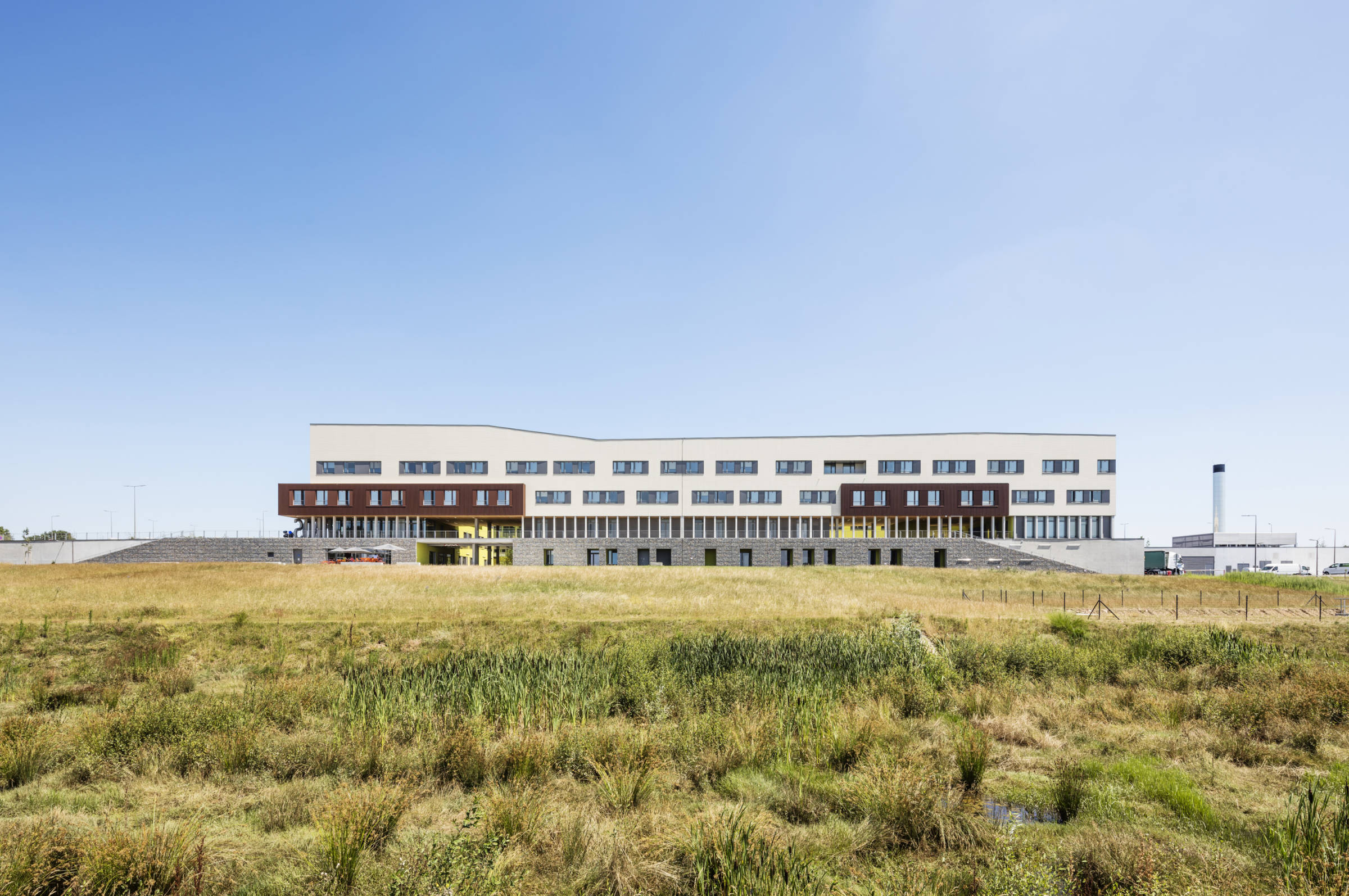 Le nouveau Centre Hospitalier Nord Deux-Sèvres prend place dans un site agricole, au milieu du bocage Poitevin. Compact, conçu sur une emprise carrée, le projet est perçu comme la superposition de nappes fonctionnelles horizontales. Il se compose, de bas en haut, d’un socle minéral, revêtu en façade sud de gabions, qui accueille la logistique et s’ouvre sur la cour de livraison. D’une césure horizontale soulignée en façade par une colonnade, et une vaste terrasse belvédère accessible aux patients. C’est le niveau du hall d’accueil, des espaces de détente et des secteurs ambulatoires : consultations, imagerie et urgences. De deux niveaux supérieurs, qui forment une masse minérale homogène au skyline ondulant, posée sur le terrain naturel au nord. Habillé de briques de terre cuite, le volume est percé de grandes «fenêtres» qui en modifient l’échelle de perception.