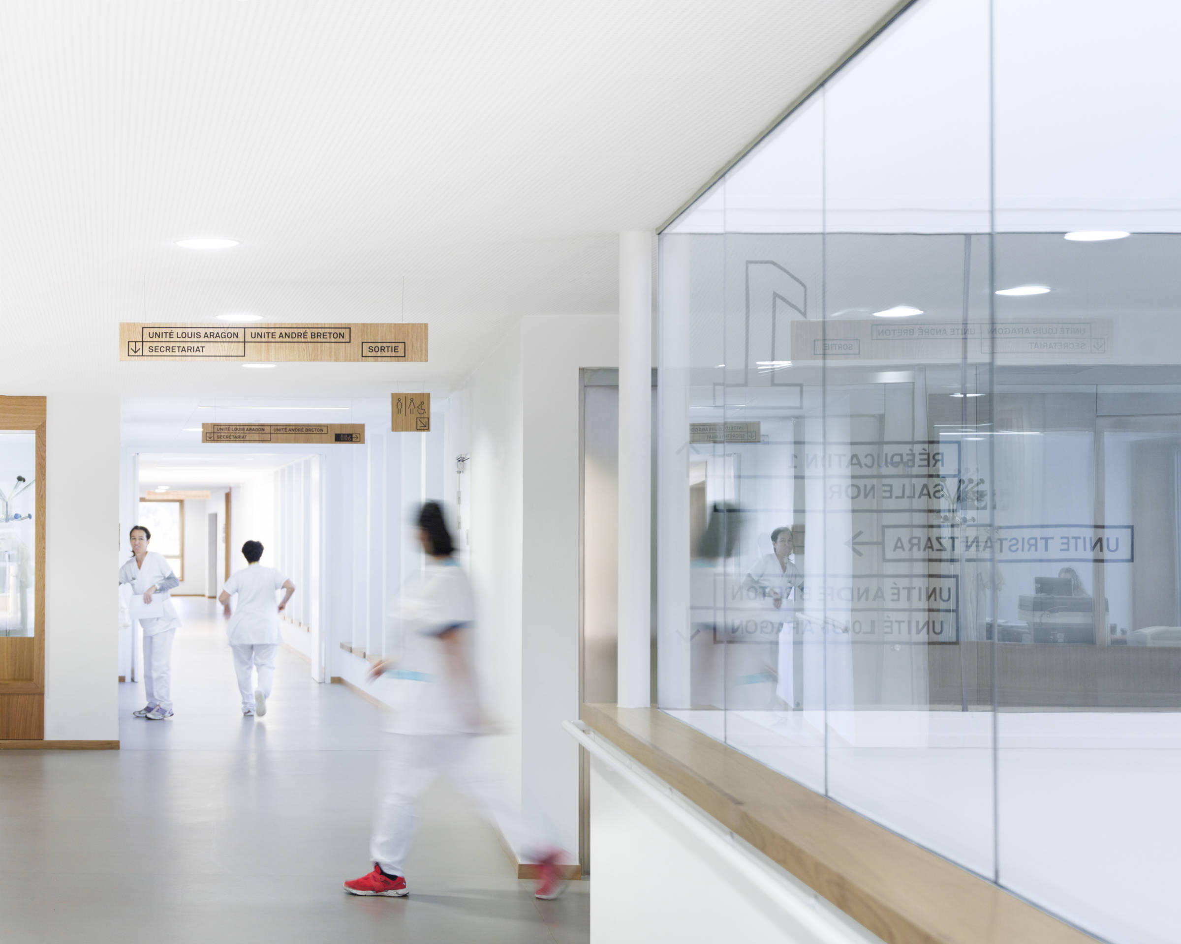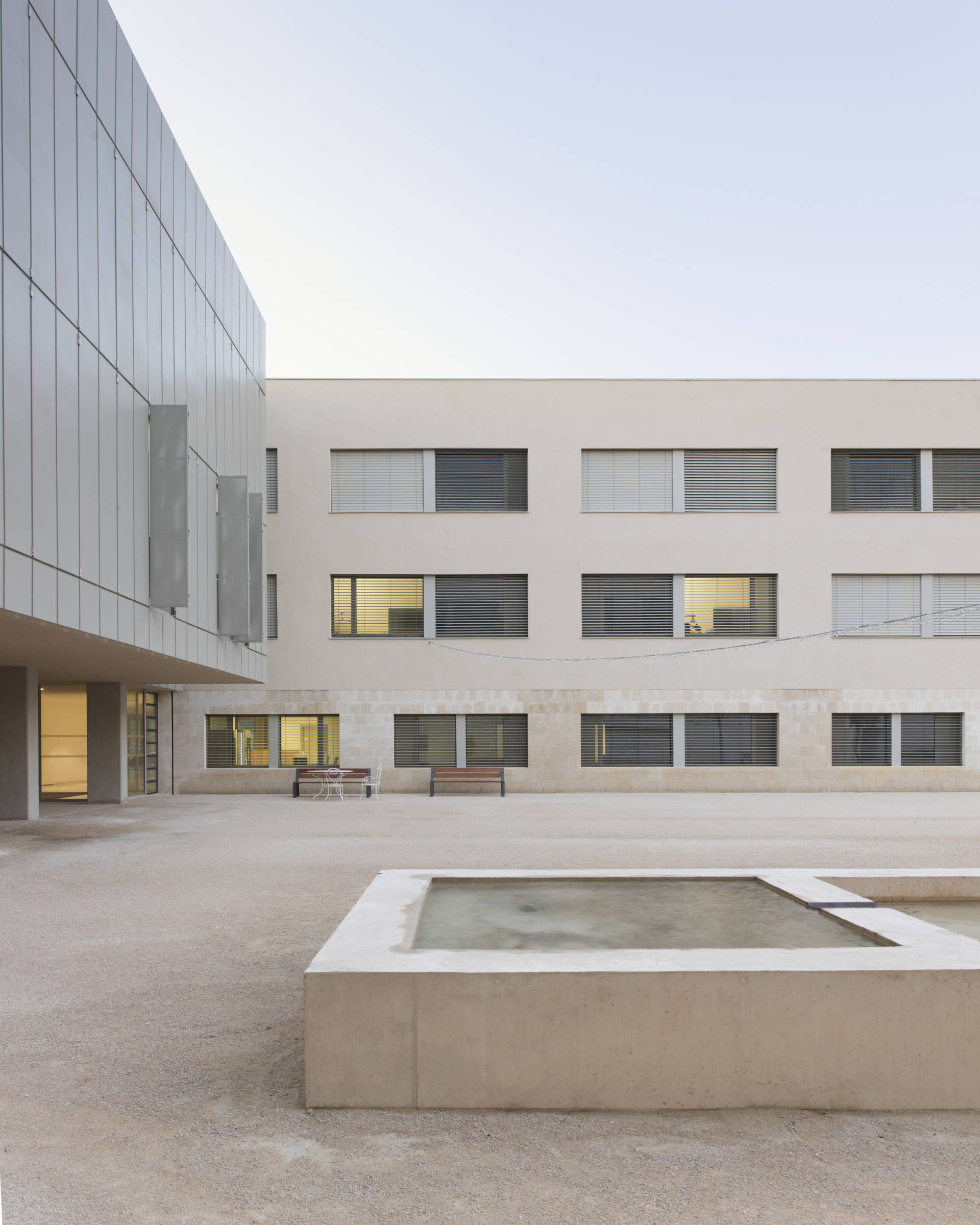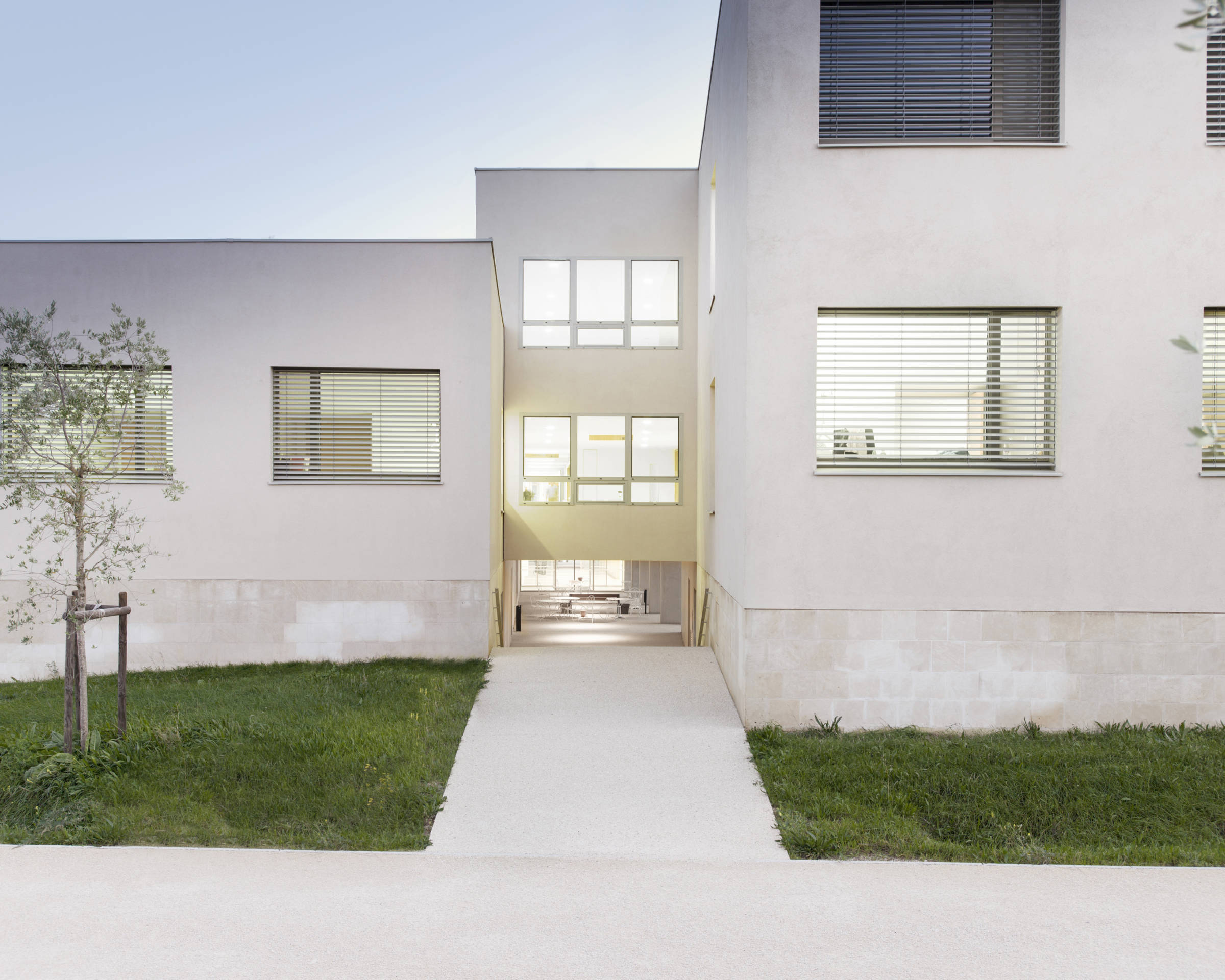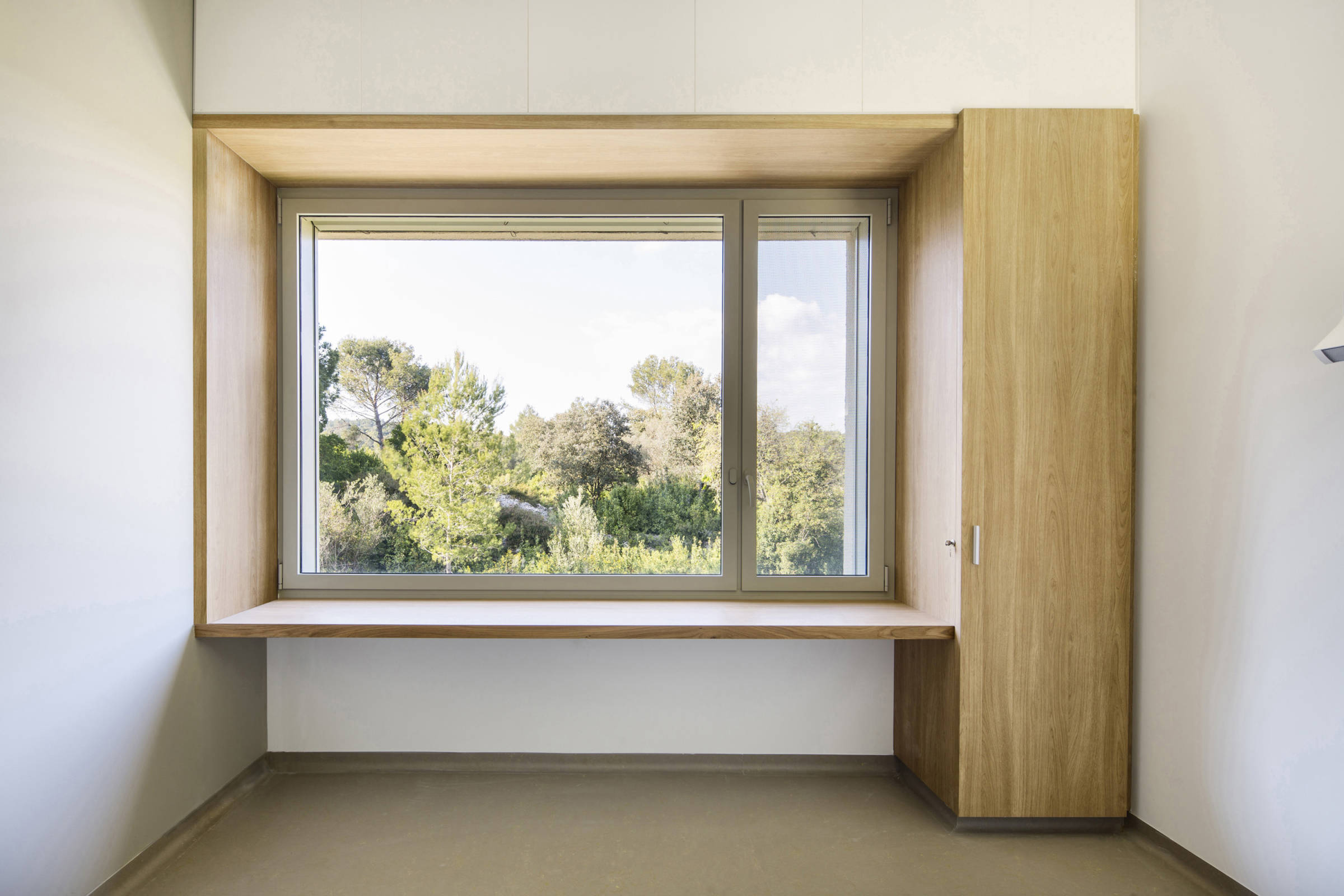 Implanté au seuil du village, précédé d’un jardin de terrasses en restanque planté d’essences de la région, l’équipement affirme son identité, unitaire et contextuelle. Soulignant l’entrée de l’établissement, une grande loggia affirme son hospitalité, et forme un « balcon » sur le paysage de garrigue alentours. Deux axes forts structurent le bâtiment, lisible et accessible : du sud au nord, depuis l’entrée, une rue relie ses espaces majeurs, espaces communs et espaces de soin, aux unités d’hébergements ; d’est en ouest, une « faille » ouvre le bâtiment sur le paysage, en dessinant une cour intérieure minérale, avec sa fontaine, ses emmanchements plantés : une véritable respiration qui égaient les espaces d’activités qui s’ouvrent sur ce paysage intérieur. A l’intérieur, l’omniprésence de la lumière naturelle, les vues cadrées sur le paysage, les ambiances douces et chaleureuses, offrent un confort remarquable.