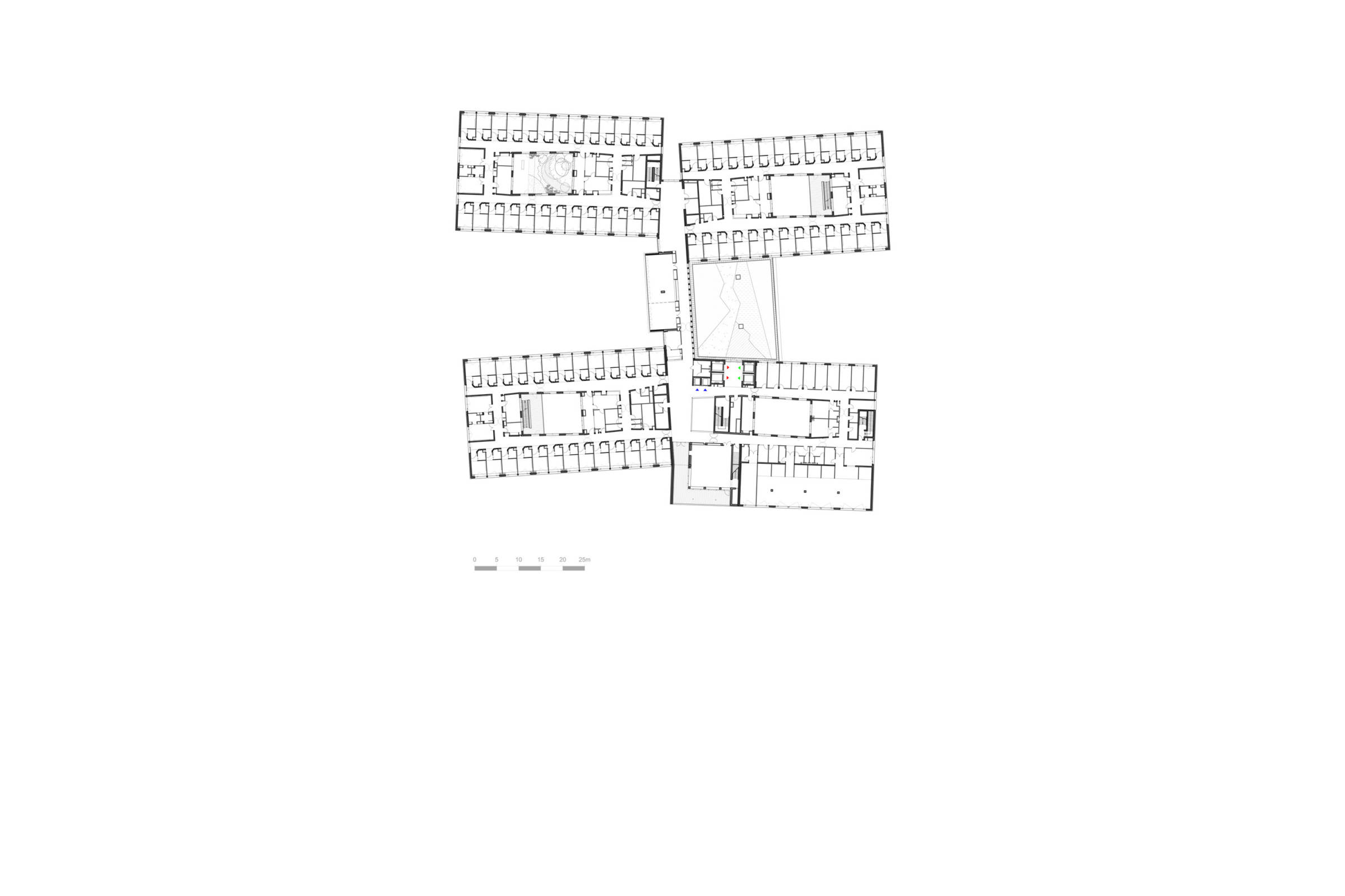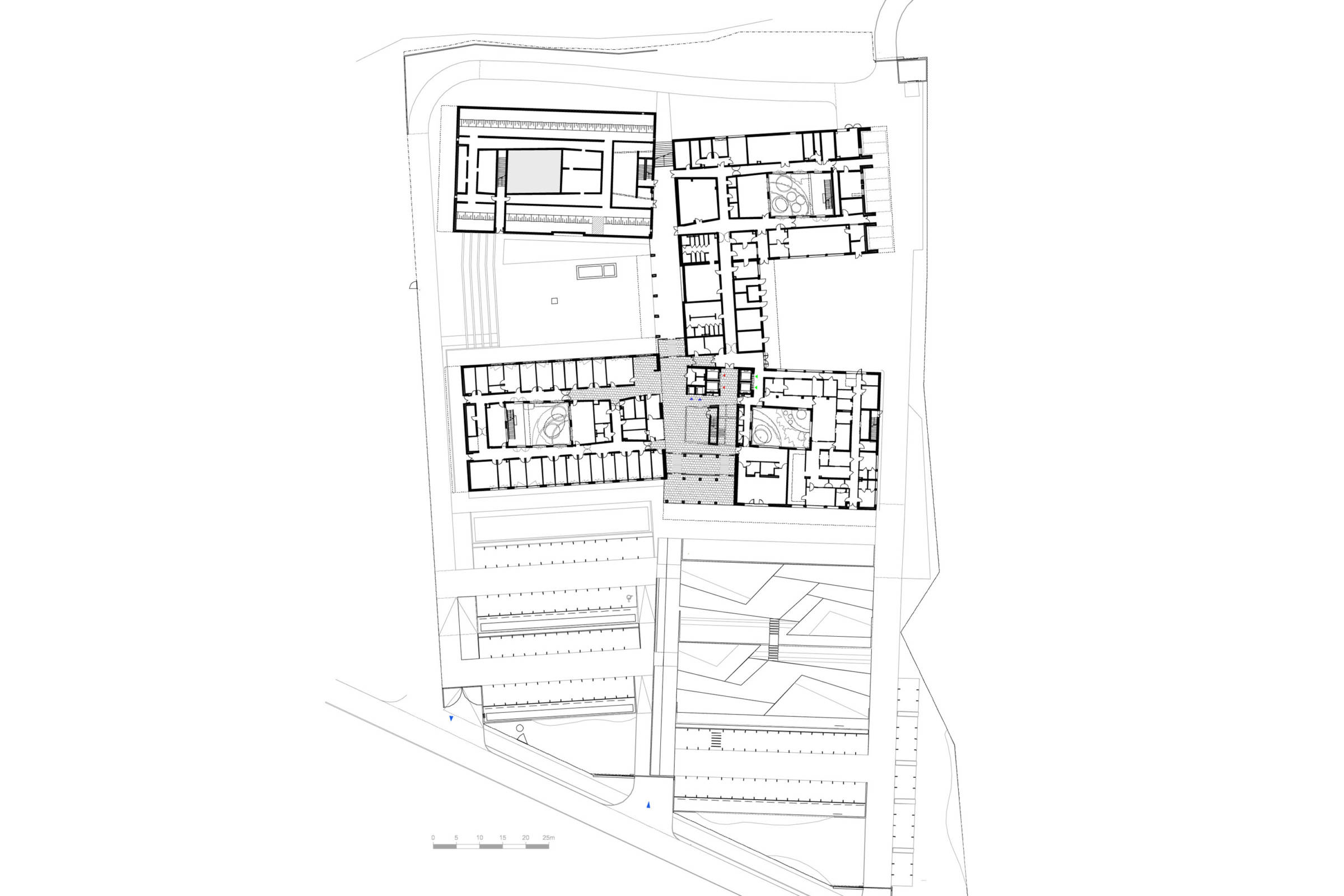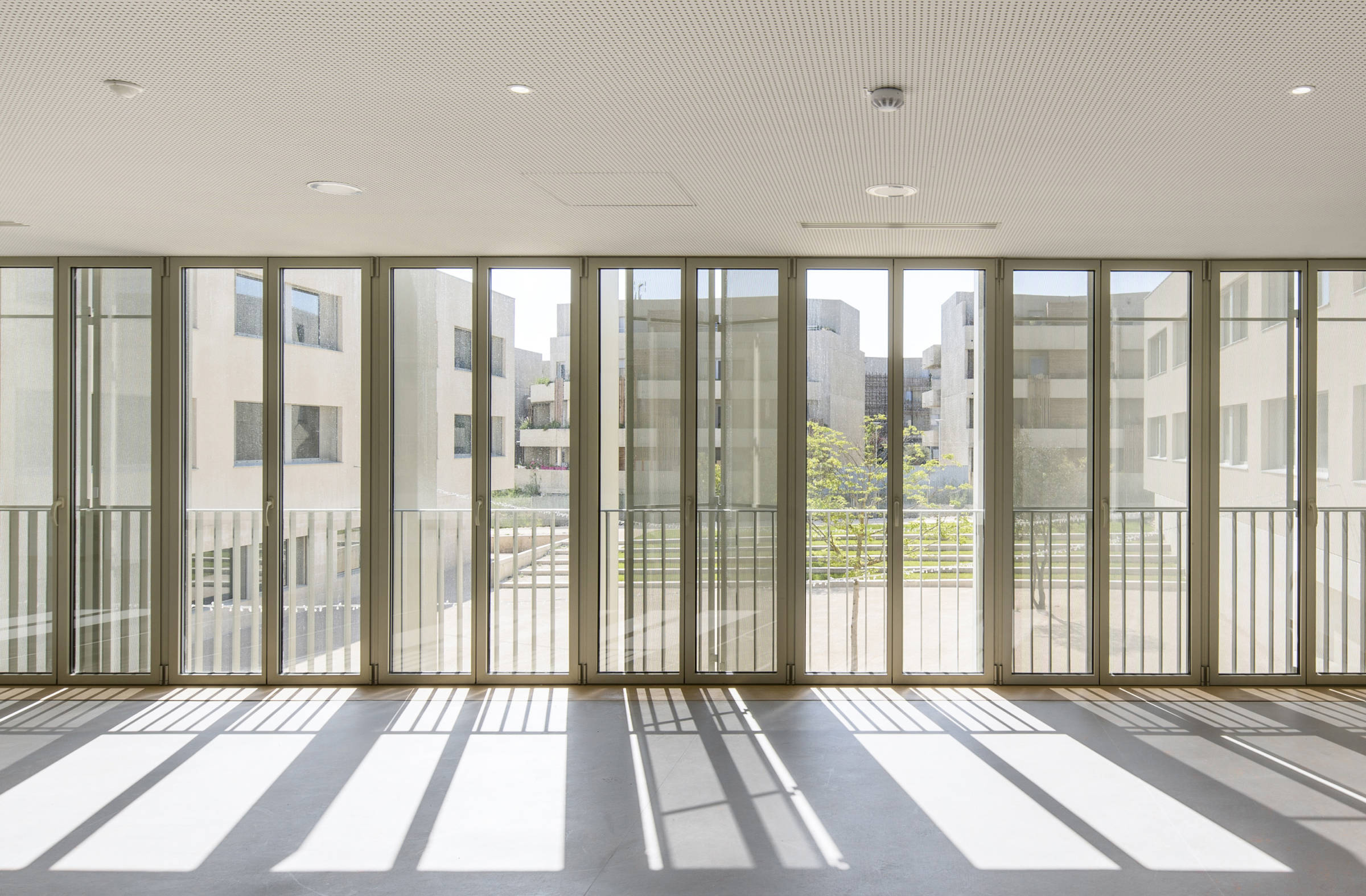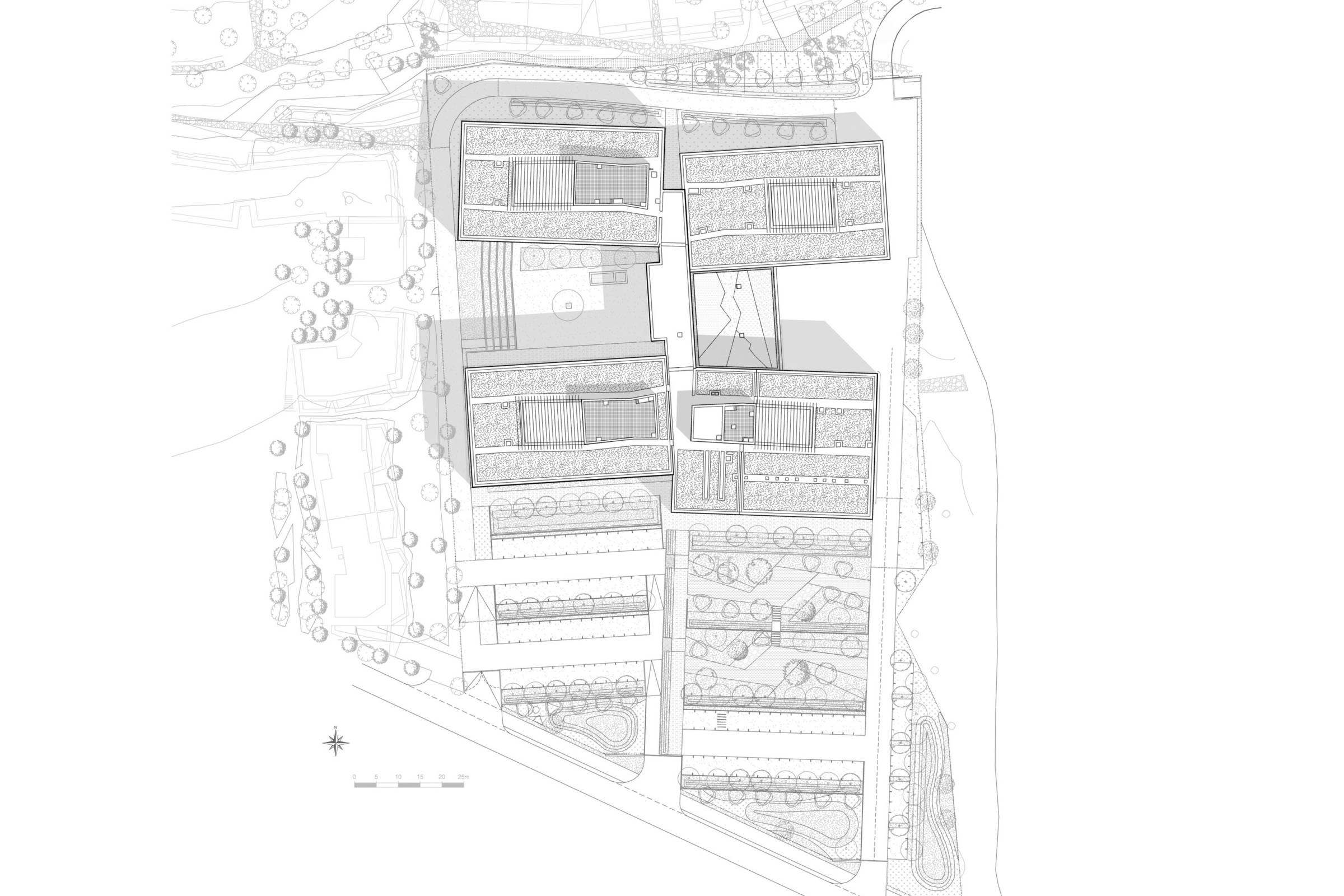 Implanté au seuil du village, précédé d’un jardin de terrasses en restanque planté d’essences de la région, l’équipement affirme son identité, unitaire et contextuelle. Soulignant l’entrée de l’établissement, une grande loggia affirme son hospitalité, et forme un « balcon » sur le paysage de garrigue alentours. Deux axes forts structurent le bâtiment, lisible et accessible : du sud au nord, depuis l’entrée, une rue relie ses espaces majeurs, espaces communs et espaces de soin, aux unités d’hébergements ; d’est en ouest, une « faille » ouvre le bâtiment sur le paysage, en dessinant une cour intérieure minérale, avec sa fontaine, ses emmanchements plantés : une véritable respiration qui égaient les espaces d’activités qui s’ouvrent sur ce paysage intérieur. A l’intérieur, l’omniprésence de la lumière naturelle, les vues cadrées sur le paysage, les ambiances douces et chaleureuses, offrent un confort remarquable.