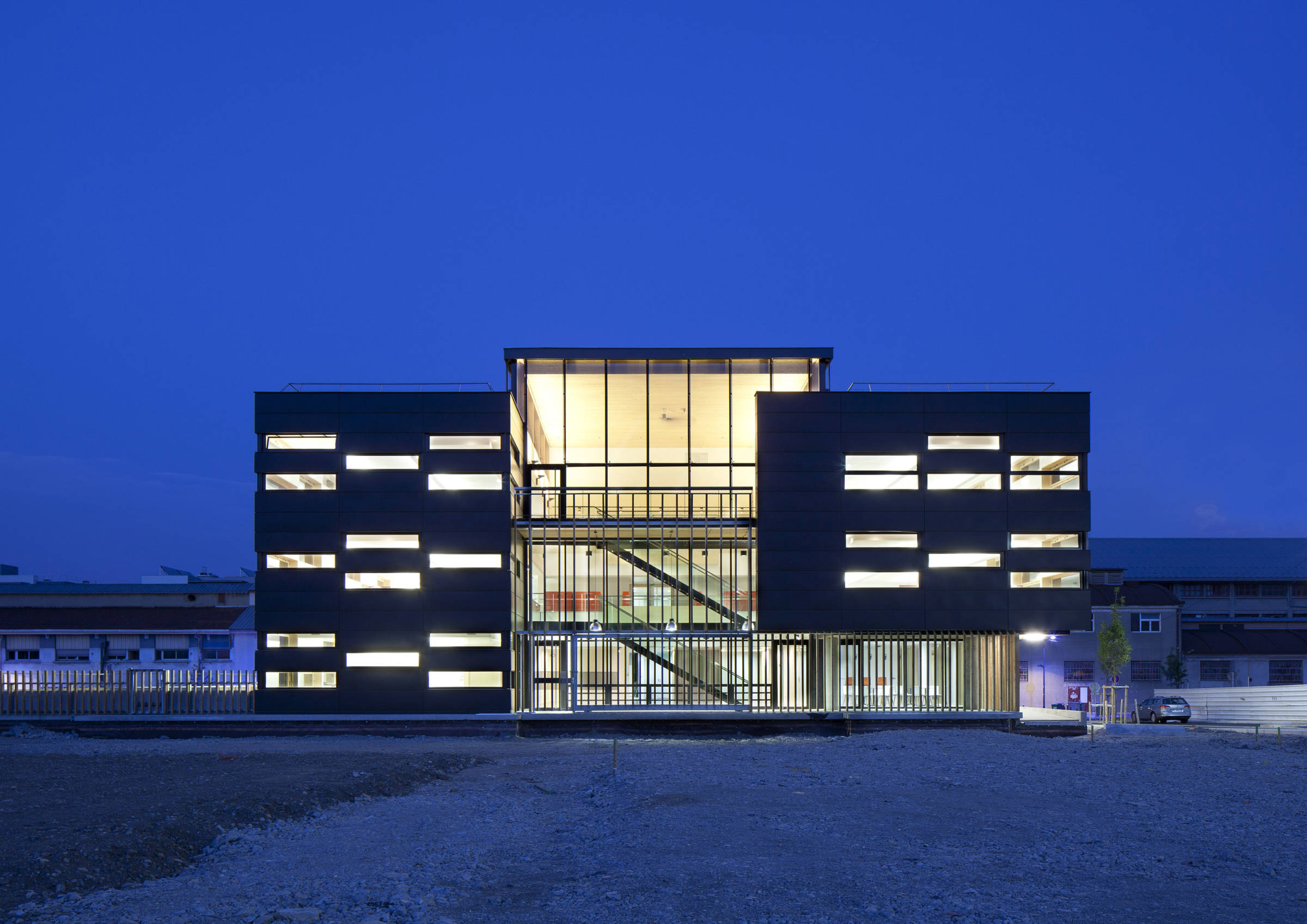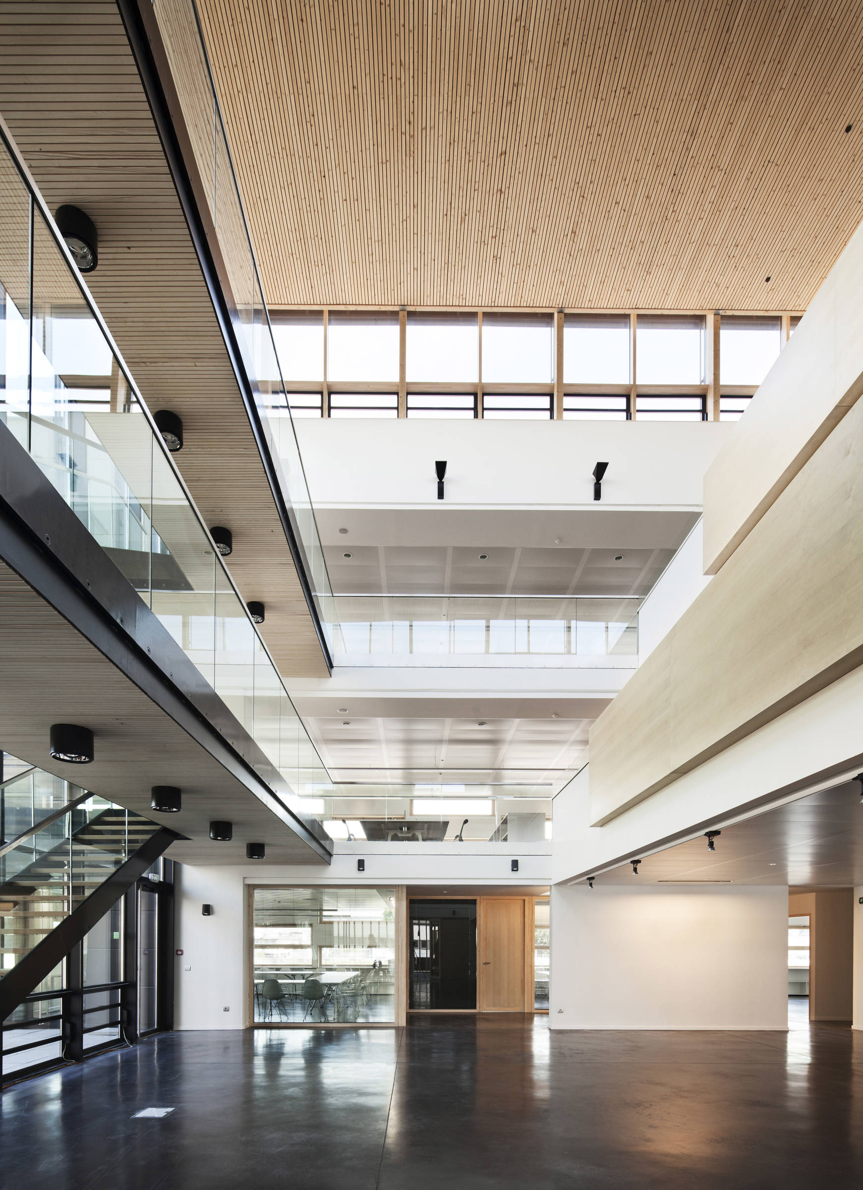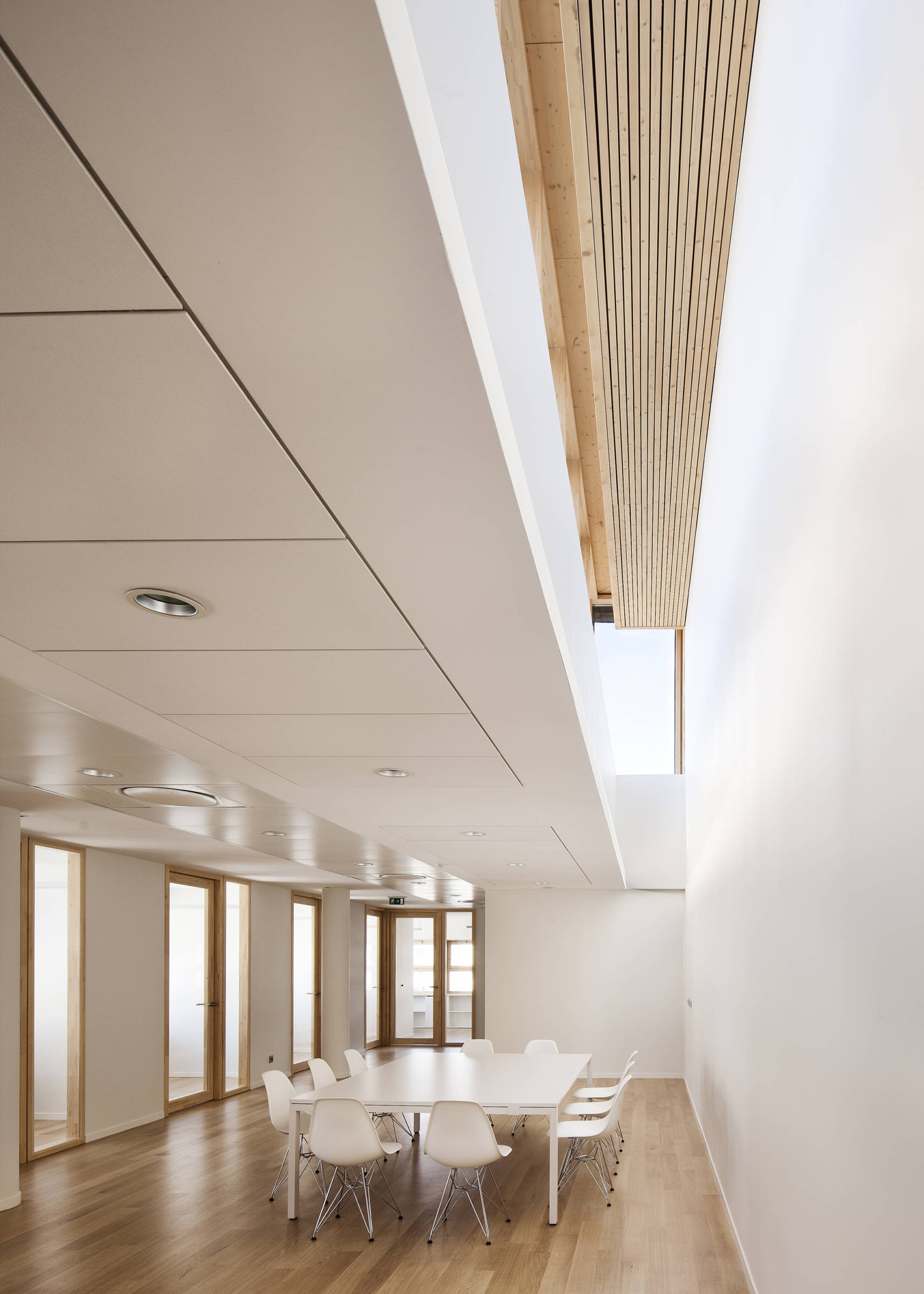 Pour sa nouvelle agence à Grenoble, implantée au cœur du nouveau quartier Bouchayer Viallet, Groupe-6 a conçu un bâtiment passif, exemplaire sur le plan durable et proposant des espaces de travail et de vie lumineux et chaleureux : donnant sur un atrium toute hauteur, sur le jardin public et le paysage grandiose du Vercors, les plateaux ouverts ou bureaux individuels sont complétés par des espaces de travail partagés et de convivialité offrant des configurations variées et évolutives. Compact, le bâtiment est doté d’une façade épaisse performante, percée de longues ouvertures horizontales qui cadrent des visions intérieures et lui donnent une image lisible et forte. Il bénéficie d’une ventilation naturelle, d’un système de chauffage et de rafraichissement performant, basé sur l’utilisation de la nappe phréatique et d’une régulation automatisée des systèmes d’éclairage et de ventilation, afin d’optimiser les consommations énergétiques.