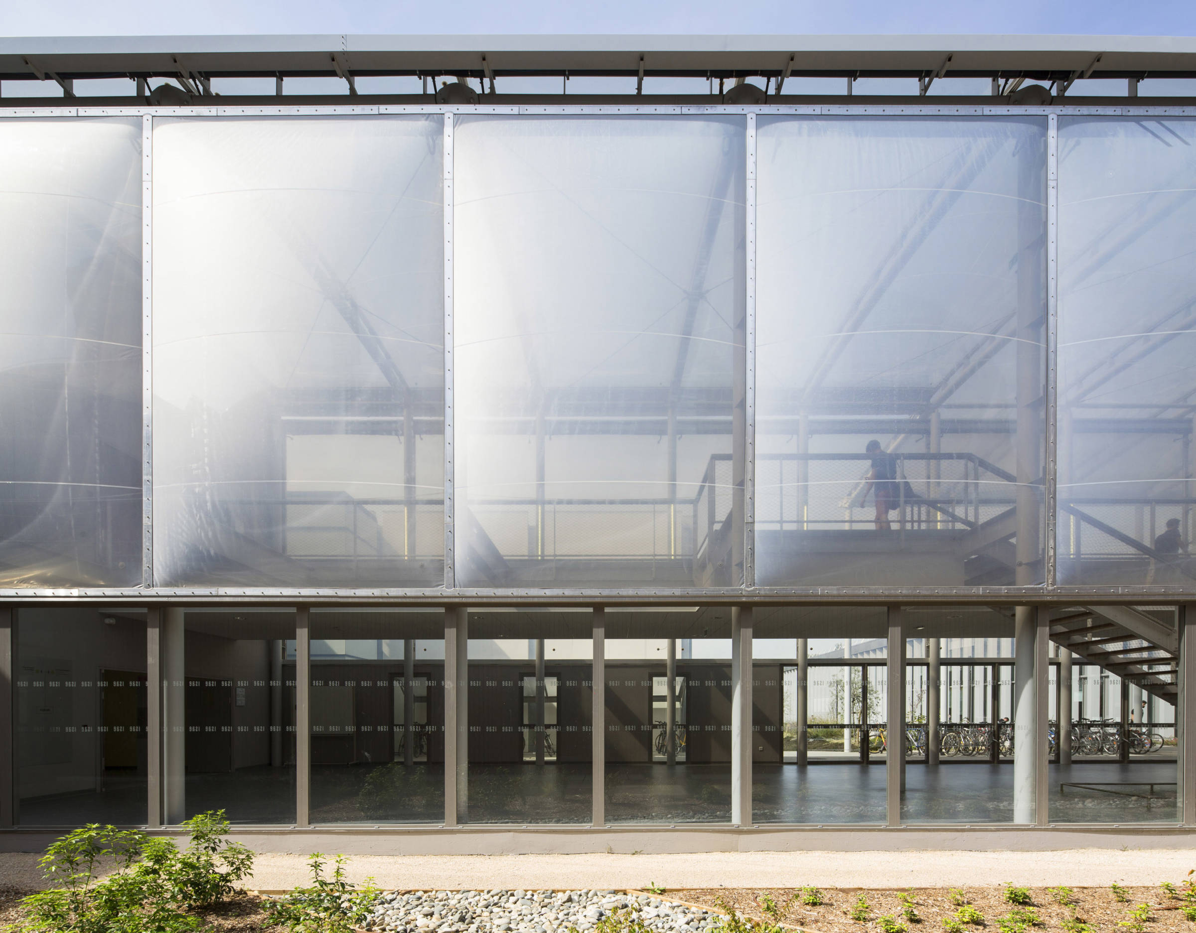 Le nouvel Institut Supérieur de l’Aéronautique et de l’Espace (ISAE) est constitué du regroupement de SUPAERO et de l’ENSICA pour former le principal pôle d’enseignement et de recherche dans cette spécialité en Europe. Dans un campus vert, au bord du canal du midi, le projet se développe sur une partie existante réhabilitée et une partie neuve. Unifiant les bâtiments neufs et existants, une «peau» commune lui offre un nouveau visage plus qualitatif et dynamique. Sa trame de 1,35 mètre, souple, permet une variété de cloisonnements intérieurs. La verticalité des brise-soleil en toile tendue joue avec l’horizontalité des acrotères et du soubassement, décollé du sol. Des évènements singuliers animent cette trame régulière : l’amphithéâtre, traité comme une carlingue en aluminium, rompt l’alignement des lignes verticales, soulignant le forum. L’entrée principale, précédée d’un parvis, s’insère sous le grand porche en ETFE, transparent, ouvrant sur le forum et sur le patio planté en arrière-plan. Apportant lumière et vues au cœur des espaces d’enseignement, les patios et jardins intérieurs, traités avec des murs rideaux en bois naturel, chacun avec leur identité, forment des lieux de repos, et autant de repères dans le bâtiment.