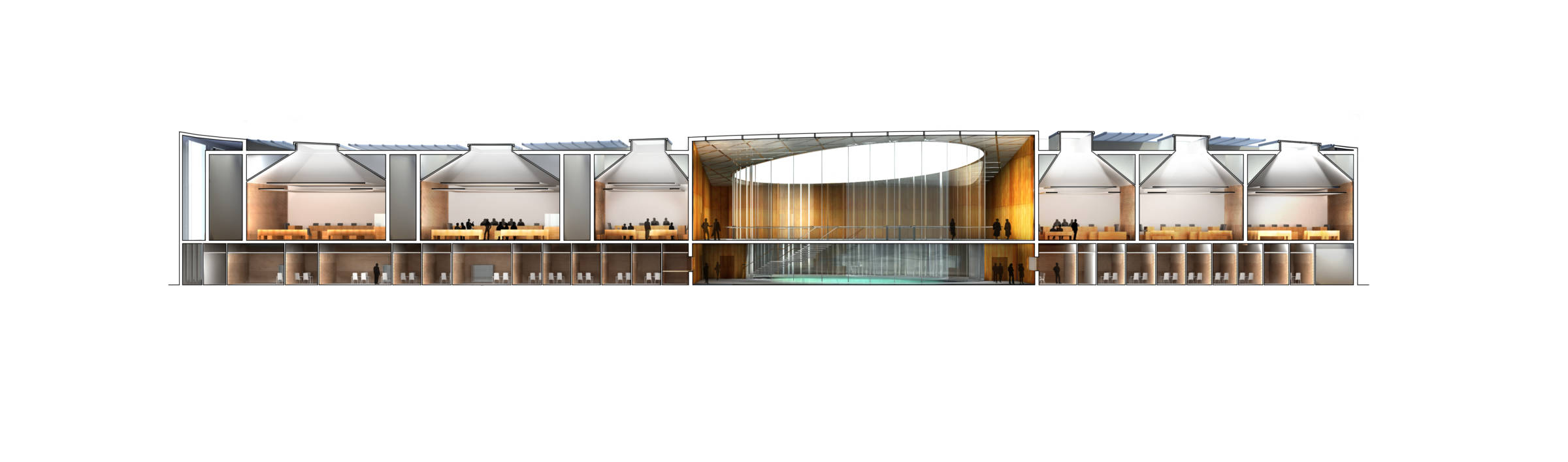 L’architecture du nouveau Palais de Justice de Caen, au cœur du vaste projet urbain de requalification de la presqu’île, conjugue autorité et douceur, et s’exprime comme le théâtre d’une justice contemporaine qui se veut plus horizontale que verticale. L’horizontalité du bâti respecte la silhouette de la ville historique, et l’accès principal, prolongeant la grande pelouse et menant à la salle des pas perdus, place le cœur du nouveau palais en lien direct et de plain pied, avec la cité. Une cinquième façade s’offre à la vue depuis l’Abbaye aux Dames, avec une canopée dont les teintes dialoguent avec les toitures caennaises.