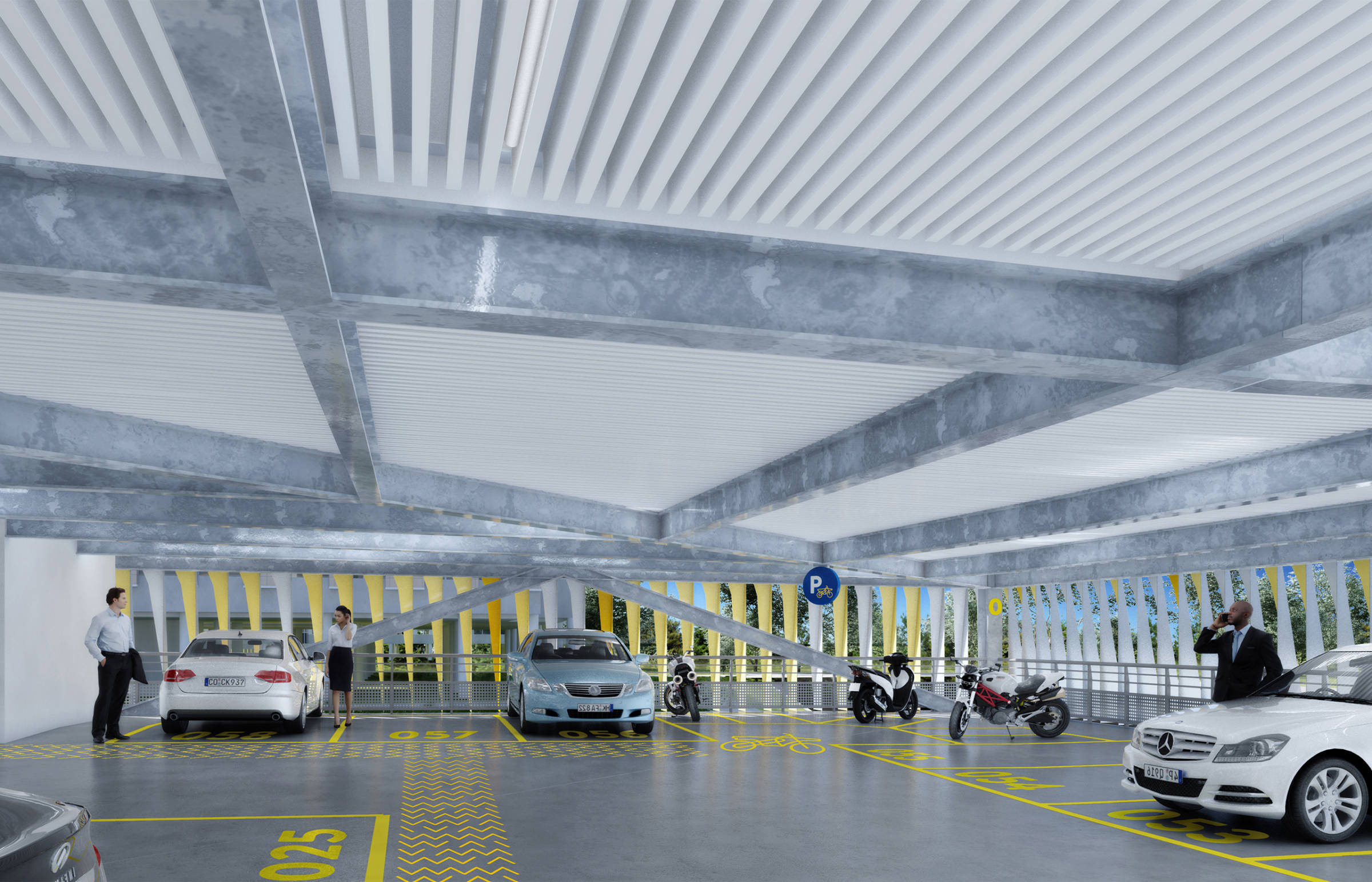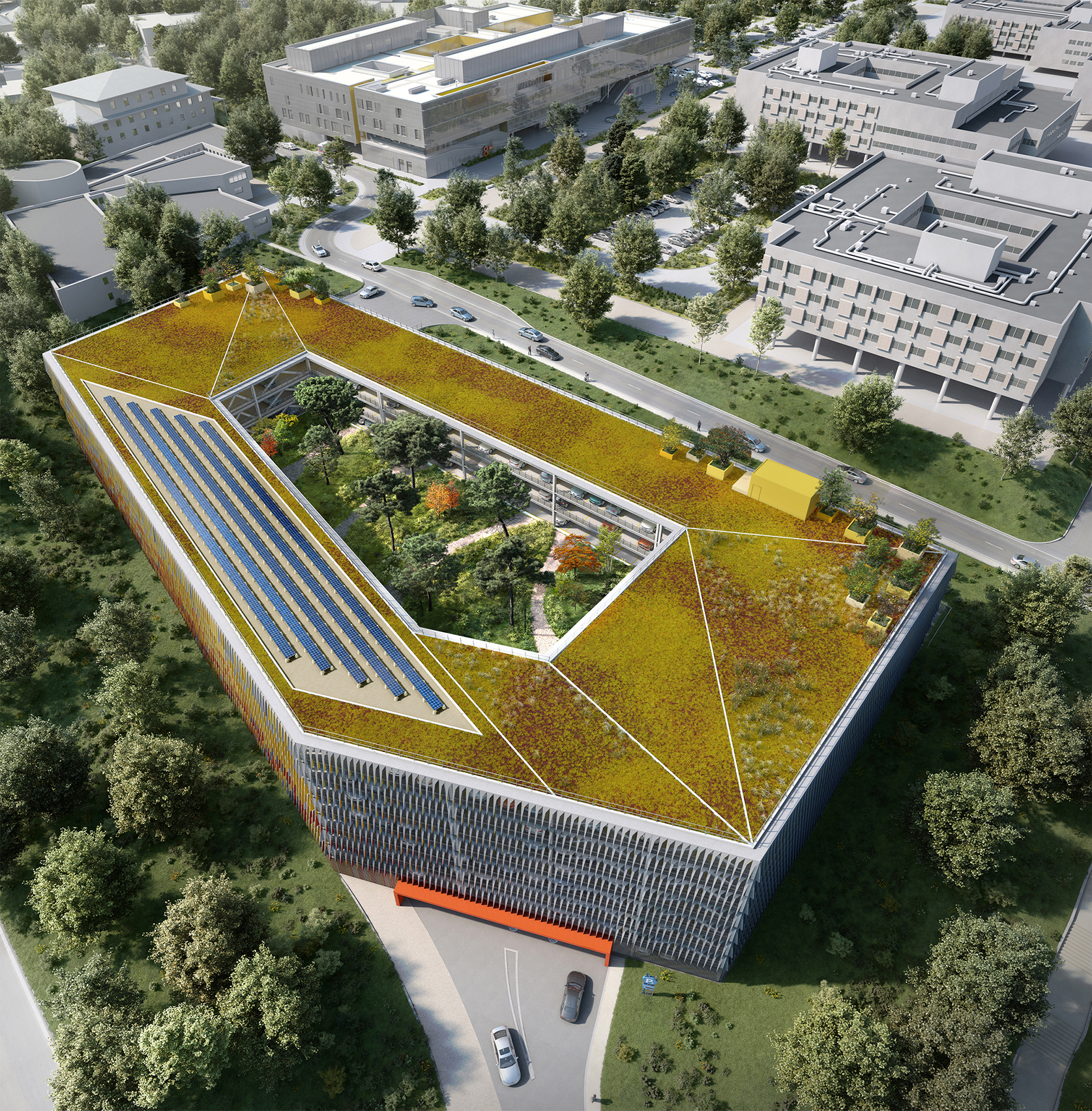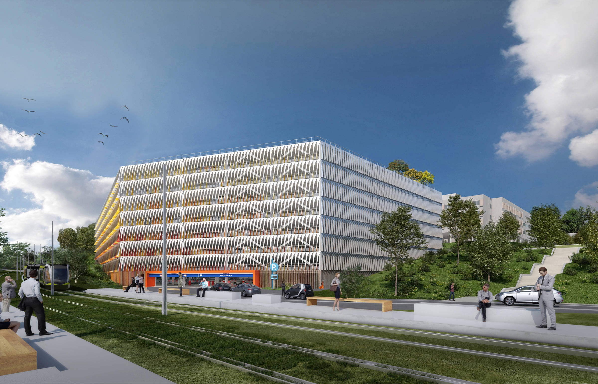 Bâtiment accueillant pour les usagers, le parking est organisé autour d’un grand jardin intérieur où la lumière naturelle et la végétation sont présentes dans tous ses plateaux. Sa volumétrie imposante s’insère harmonieusement à l’entrée de l’hôpital, s’inscrivant dans les prescriptions architecturales du CHU et dans la continuité de l’expression architecturale du nouveau bâtiment de cancérologie. L’intention étant de vouloir privilégier l’intégration de la couleur à l’existant, la « légèreté » dans l’architecture ainsi que l’utilisation de matériaux durables et résistants afin de garantir la pérennité du bâtiment. Les plateaux de stationnement se développent autour d’un vaste patio planté. Les façades extérieures sont revêtues de lames en tôles d’aluminium aux teintes chaudes, qui créent un jeu de couleur cinétique, tout en modulant sa transparence et sa perméabilité. Le parking est surmonté par une toiture largement végétalisée, constituant sa cinquième façade.