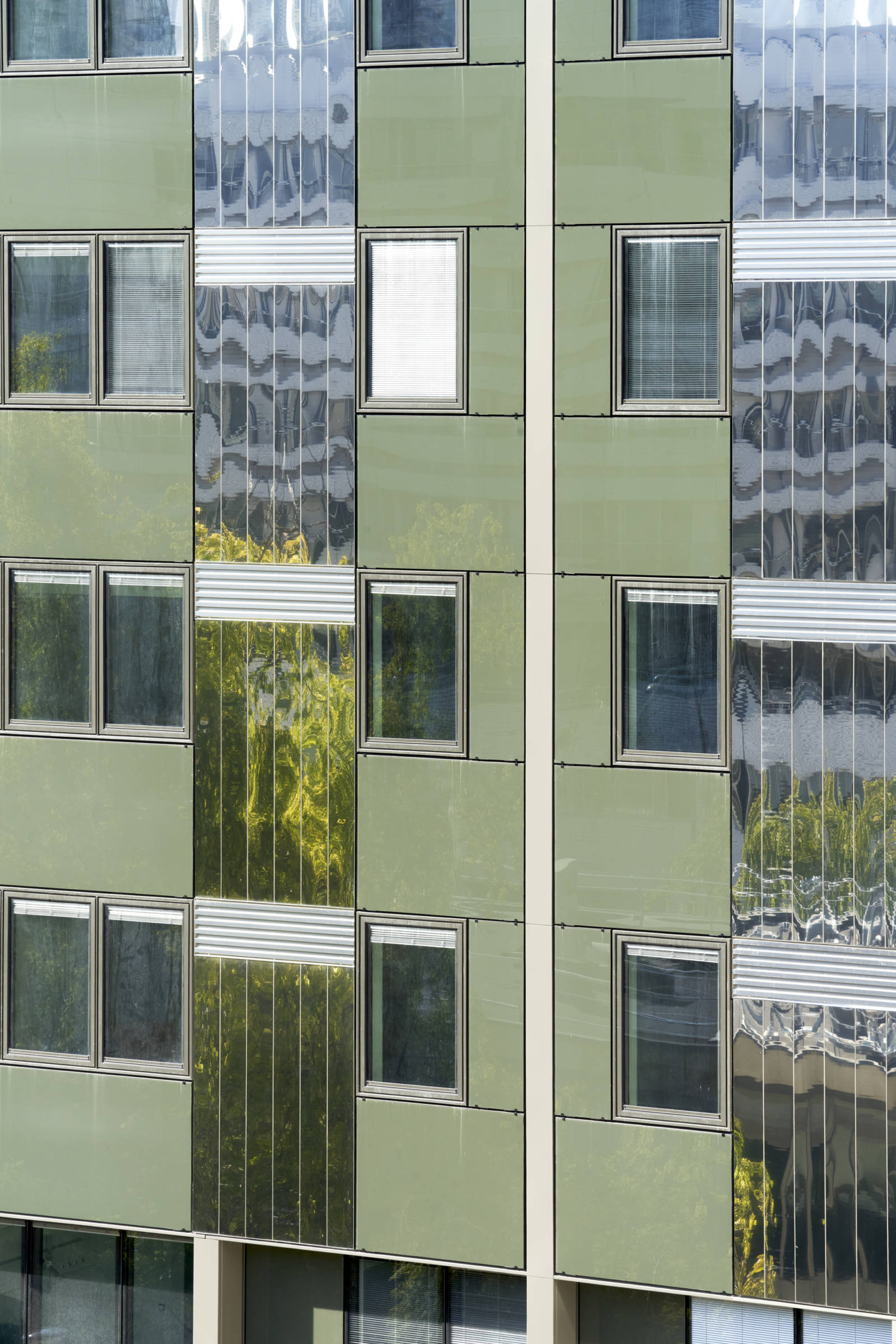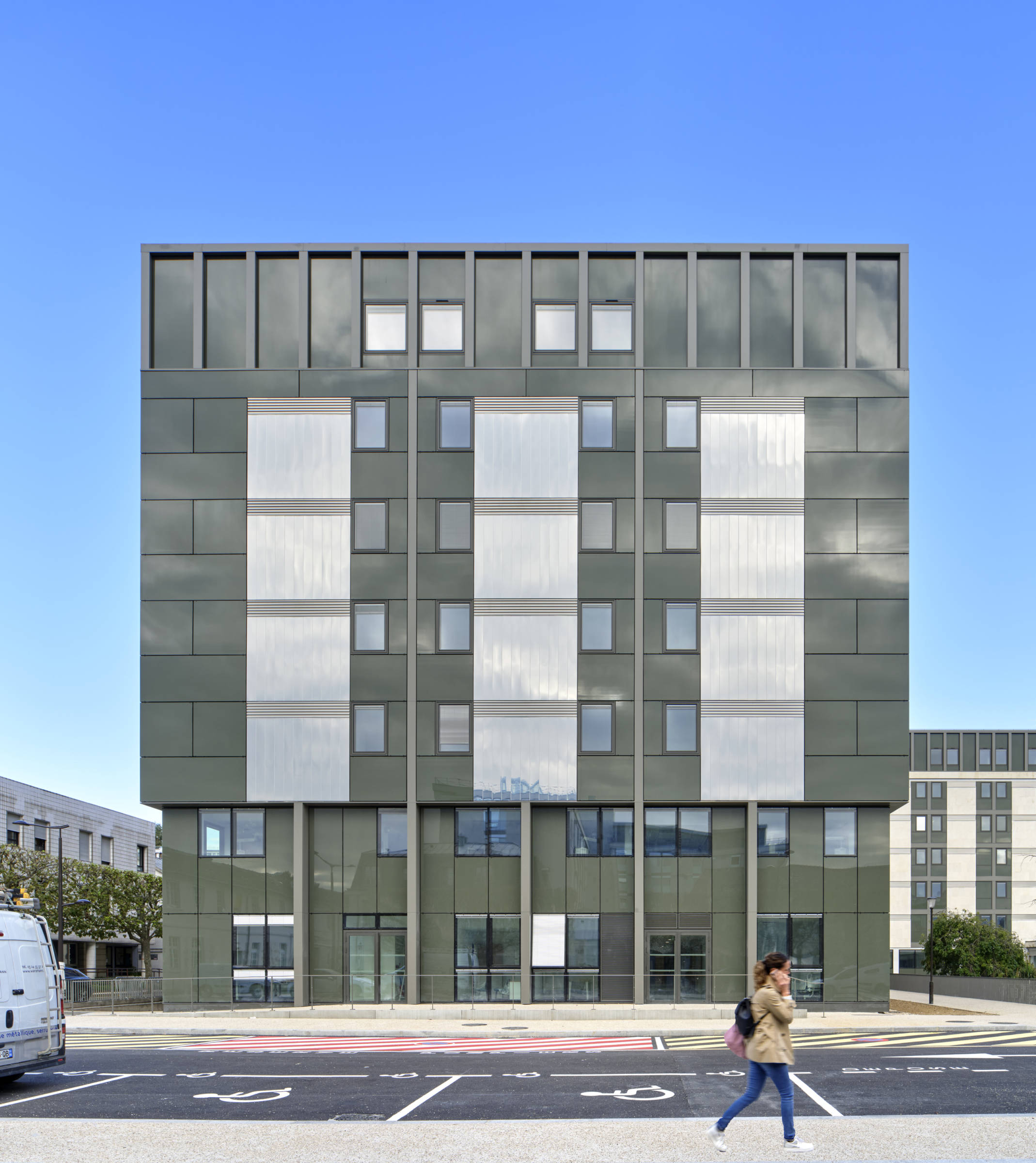 d’actualiser son image tout en instaurant une nouvelle cohérence architecturale à ce site hétérogène. L’aile Ouest de l’ancien bâtiment Castaigne, élargie sur sa façade Sud et son Pignon Ouest, revisite les codes du bâtiment existant, pour lui donner une modernité assumée : la trame modulaire et les proportions sont déclinées, la répétitivité et l’homogénéité façonnent son identité architecturale. Les teintes et les matériaux utilisés sont dans les tons de la façade existante à l’exception des parements en pierre : le parement en verre profilé armé conserve le rythme et l’impact visuel en damier de la façade existante. Une restructuration ambitieuse pour accueillir un programme complexe comprenant réanimations, hébergements et soins ambulatoires.
