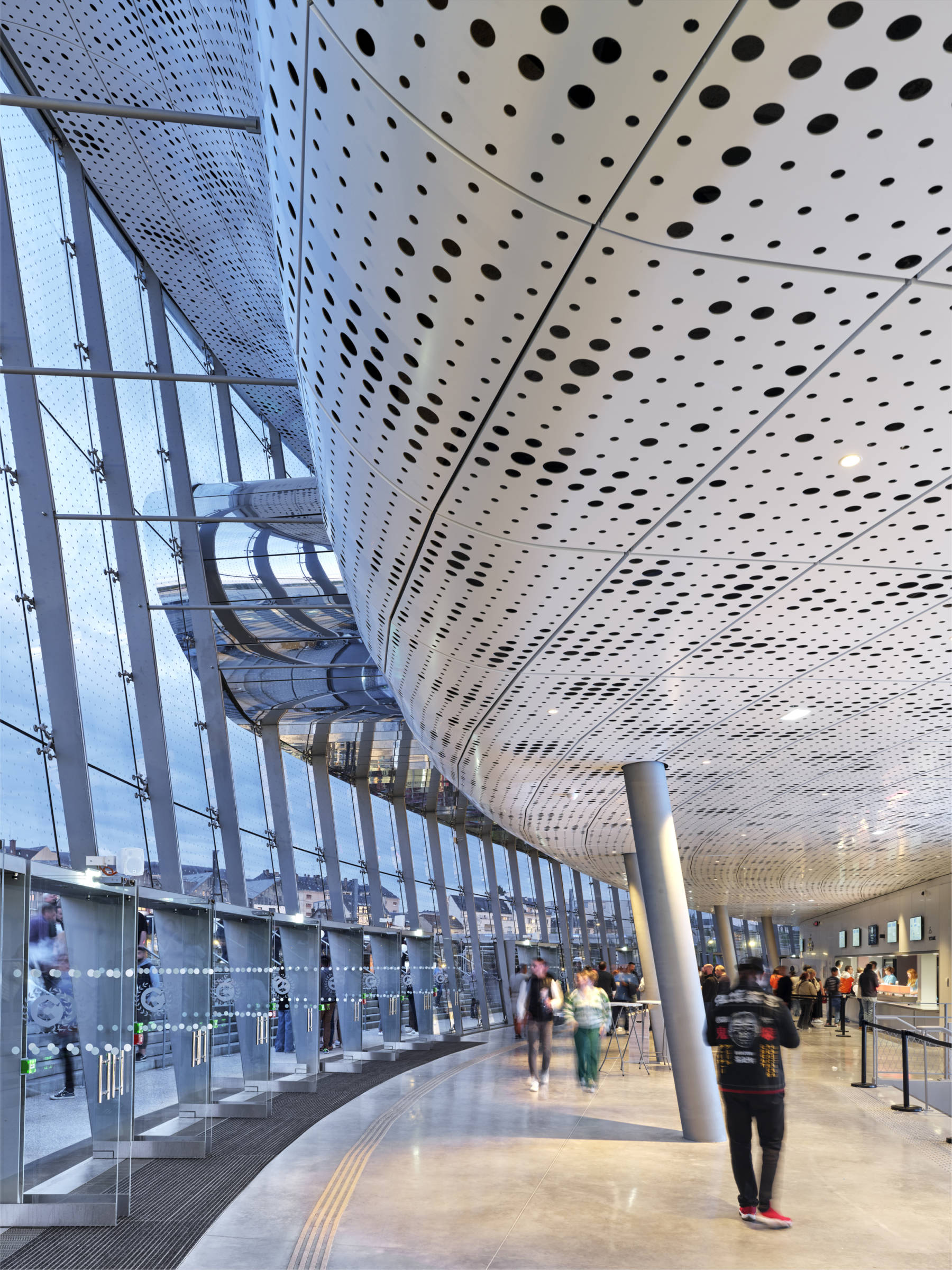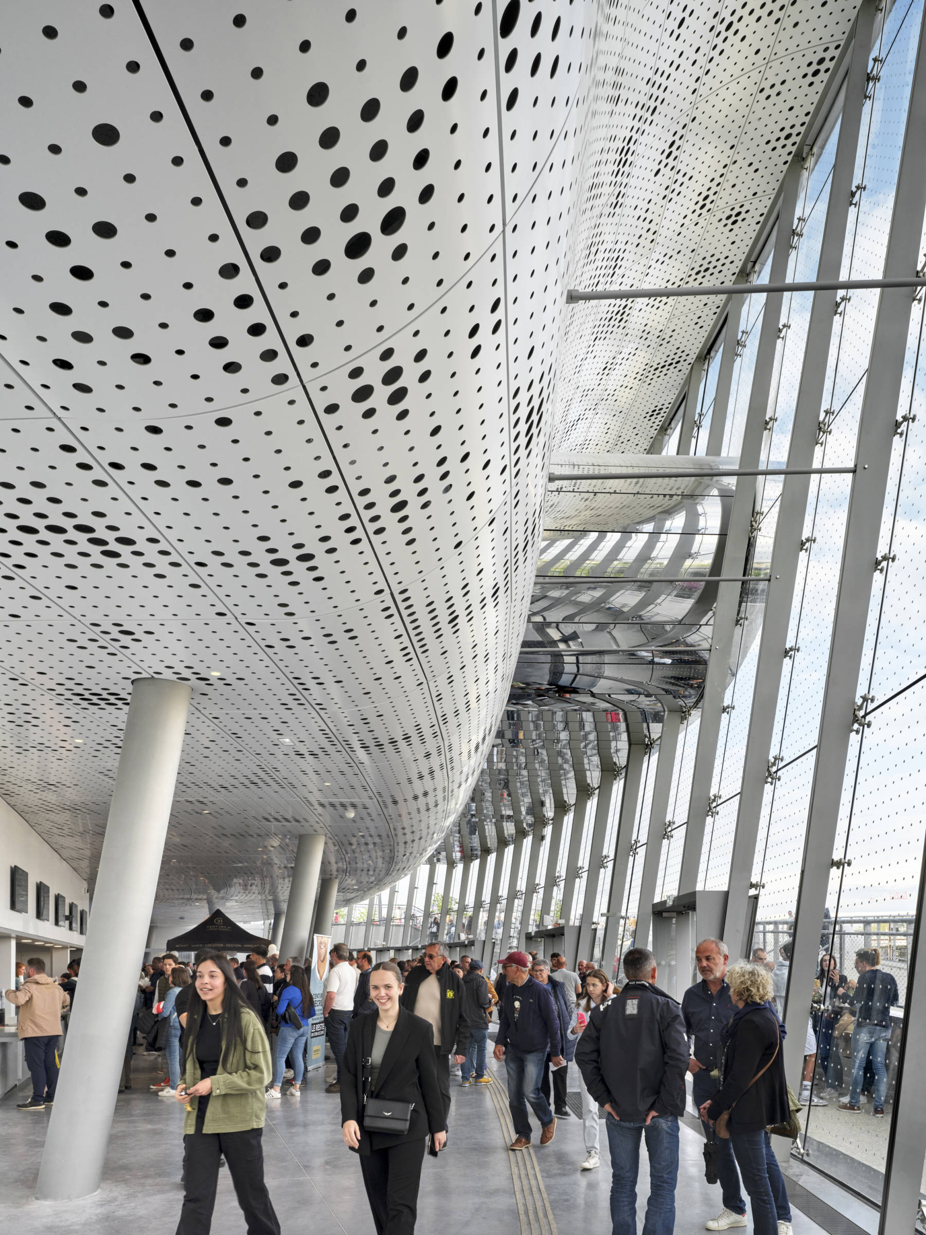 Par ses courbes dynamiques et sa grande façade ouverte sur la cathédrale, son esplanade et sa « toiture-jardin belvédère », le nouvel équipement culturel et sportif devient le vecteur identitaire du nouveau quartier du pôle gare et un lieu à vocation citoyenne. La salle en forme de chaudron et son déambulatoire en agora circulaire offrent un confort visuel optimal, et renforcent le sentiment de communion lors des évènements. Un véritable jardin sur le toit, à la palette végétale généreuse, offre la ville en spectacle et un nouvel espace public à ses habitants.