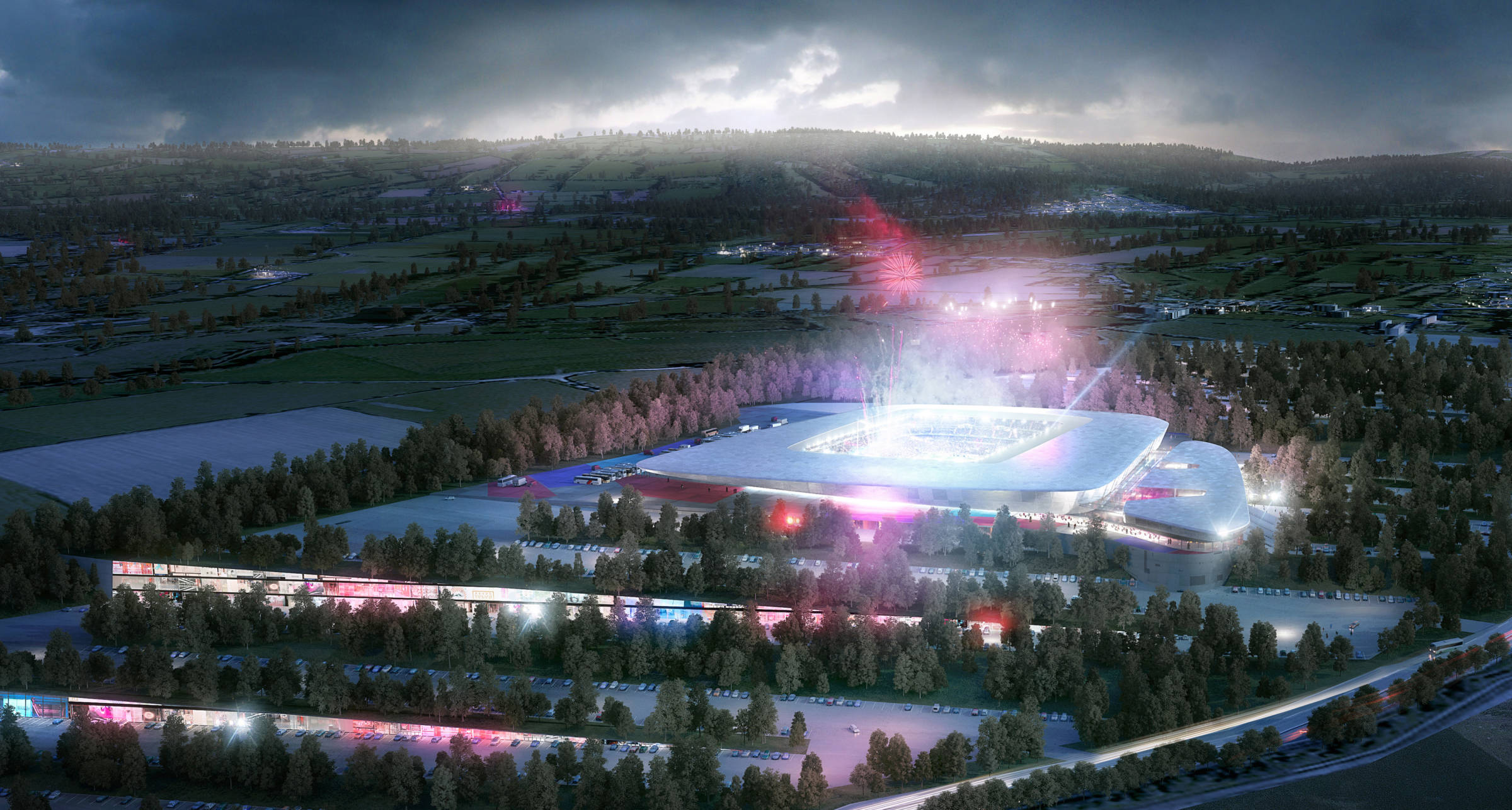 Très novateur, ce projet permet d’aller au bout du concept de modularité et de multi-activité puisque l’ensemble des équipements est mutualisé entre une arena de 3.600 places et un stade de 18.000. L’enjeu architectural est d’insérer l’équipement dans la pente et dans le végétal très présent sur le site. Le projet propose une esplanade périphérique offrant une vue panoramique sur la mer coté aval, une grande place urbaine qui donne accès aux gradins bas du stade. Le profil de la couverture vient en continuité du relief tout en affirmant l’identité de cet équipement majeur de l’agglomération de Cherbourg. Les deux volumes, arena et stade, sont distincts mais on perçoit un seul équipement. La peau métallique est déployée sous la forme d’une coque inversée, nacrée et opalescente, et enserre la totalité du projet et des espaces abrités périphériques.